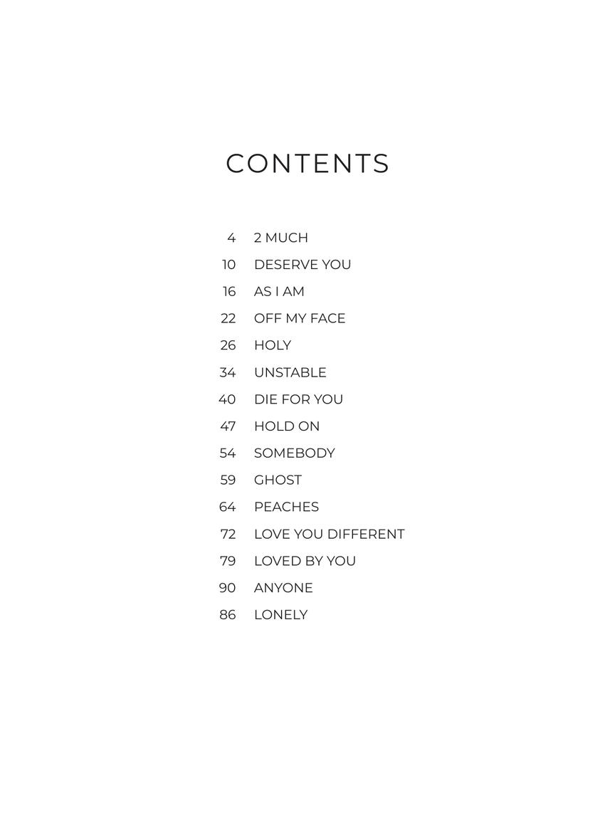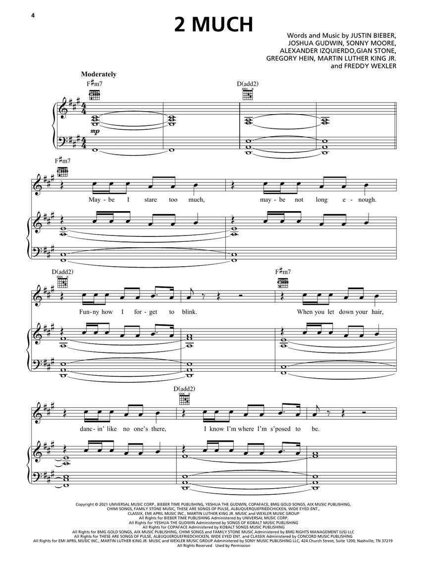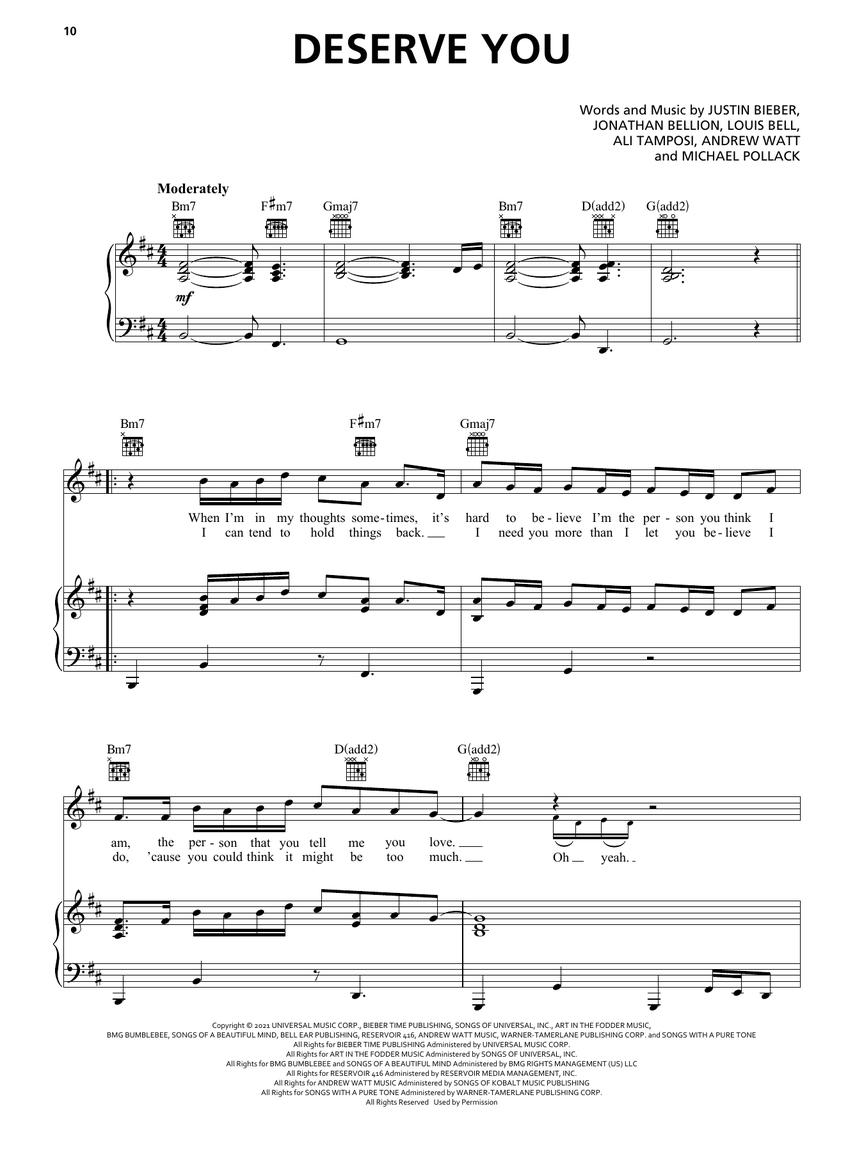 15 songs from the 2021 release which debuted atop the Billboard® 200 album charts by this Canadian star. Our collection of piano/vocal/guitar arrangements includes: Anyone • Die for You • Hold On • Holy • Lonely • Love You Different • Peaches • Somebody • Unstable • and more.