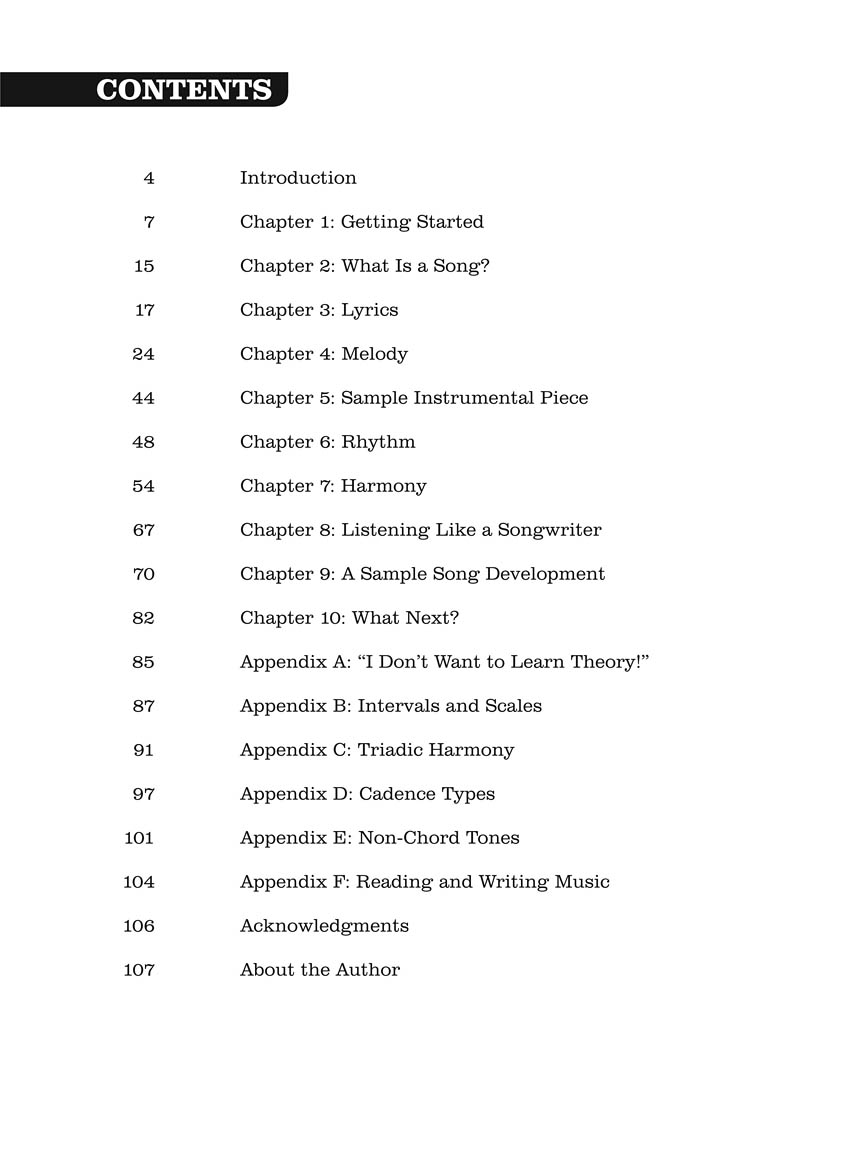 Your first song is the hardest one you will ever write. This book is designed to help you accomplish that goal. We're not going to jot down just any song, but one that you are proud of, one that gives you the confidence and the process required to write your second song, your third song, and on and on. Here you will find the basic musical knowledge you need and a process for putting that knowledge to work. Let's get started. Let's make you into a songwriter! Includes access to audio examples online for download or streaming. Audio is accessed online using the unique code inside the book and can be streamed or downloaded. The audio files include PLAYBACK+, a multi-functional audio player that allows you to slow down audio without changing pitch, set loop points, change keys, and pan left or right.