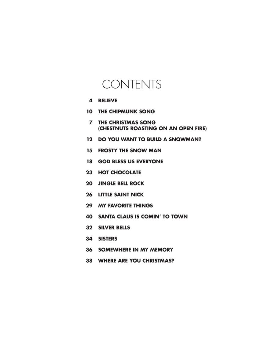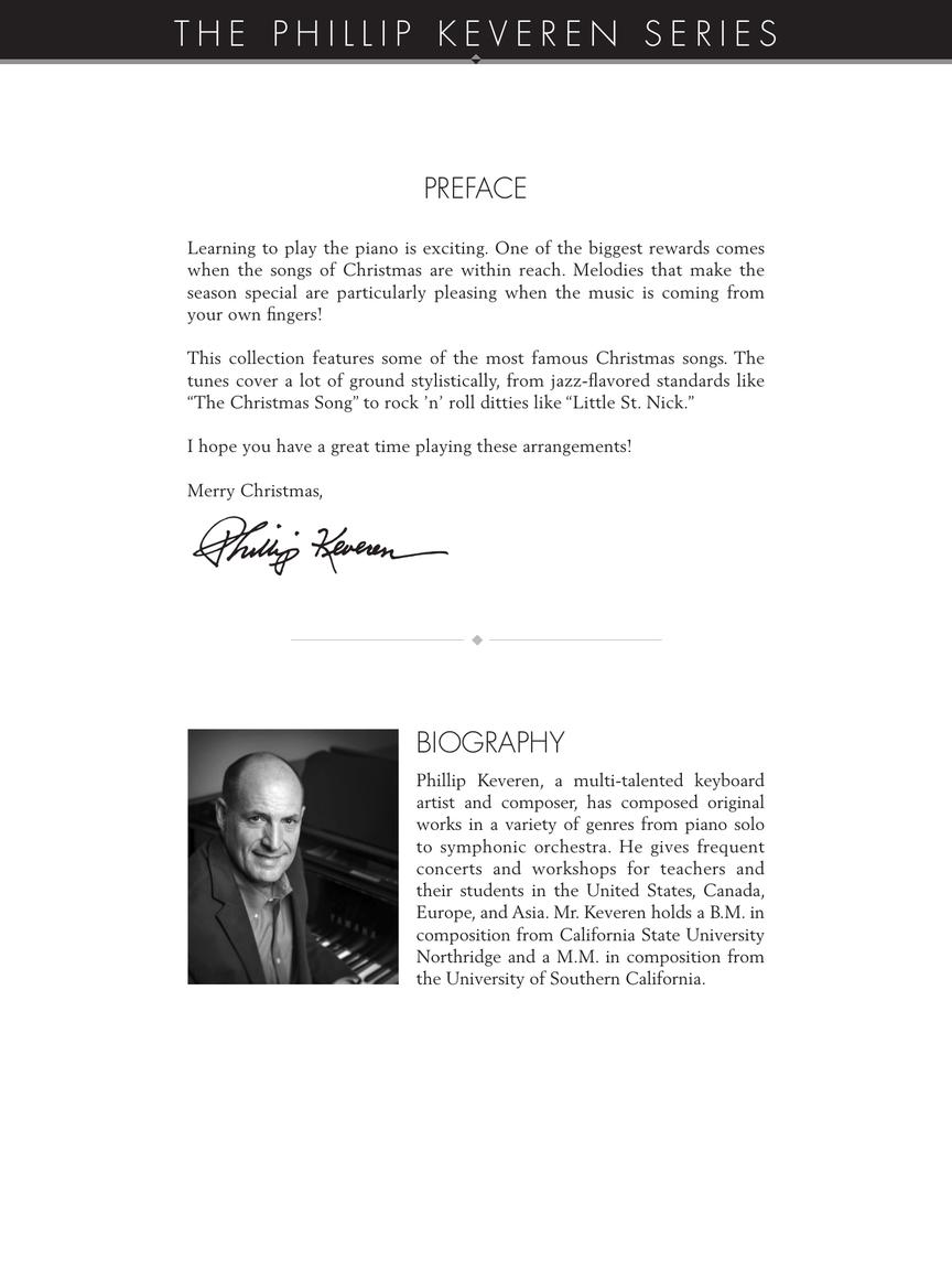 15 yuletide songs arranged in that special Phillip Keveren style for early-level players, including: Believe • The Chipmunk Song • The Christmas Song (Chestnuts Roasting on an Open Fire) • Do You Want to Build a Snowman? • Frosty the Snow Man • God Bless Us Everyone • Hot Chocolate • Jingle Bell Rock • Little Saint Nick • My Favorite Things • Santa Claus Is Comin' to Town • Silver Bells • Sisters • Somewhere in My Memory • Where Are You Christmas?