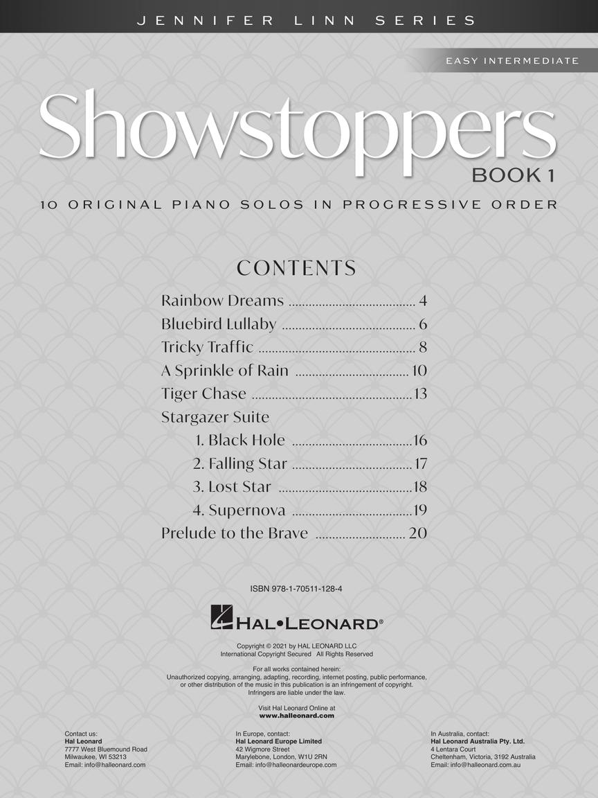 The Showstoppers Book 1 collection includes 10 easy intermediate originals: Rainbow Dreams • Bluebird Lullaby • Tricky Traffic • A Sprinkle of Rain • Tiger Chase • Stargazer Suite (four movements: 1. Black Hole; 2. Falling Star; 3. Lost Star; 4. Supernova) • Prelude to the Brave.