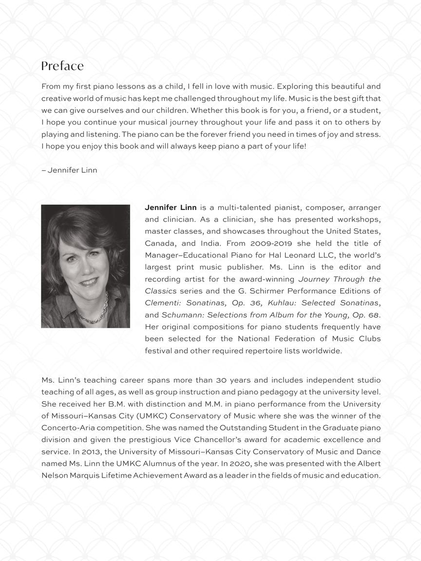 The Jennifer Linn Series features carefully leveled collections of either popular music arrangements or original compositions. The pieces or songs in each book are placed in a progressive order so students can learn new skills as they advance through the book. Written for piano students of all ages, there are five levels in the series: Early Bird (Pre-Staff), Easy Elementary, Elementary+, Easy Intermediate, Intermediate+.