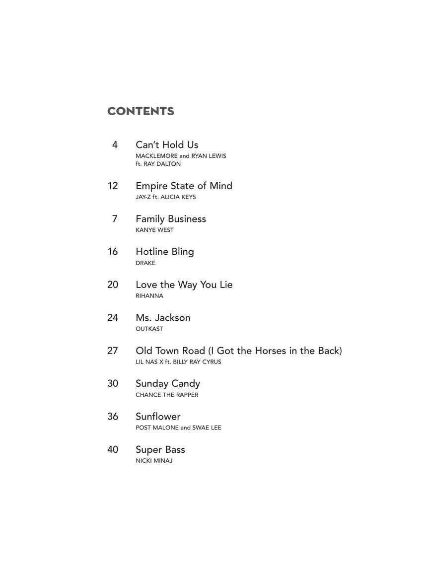 Transcrições para piano solo; incluindo: Can't Hold Us (Macklemore) • Empire State of Mind (Jay-Z ft Alicia Keys) • Family Business (Kanye West) • Hotline Bling (Drake) • Love the Way You Lie (Rihanna) • Ms Jackson (Outkast) • Old Town Road (Lil Nas X) • Sunday Candy (Chance the Rapper) • Sunflower (Post Malone & Swae Lee) • Super Bass (Nicki Minaj).