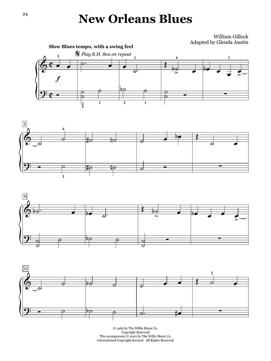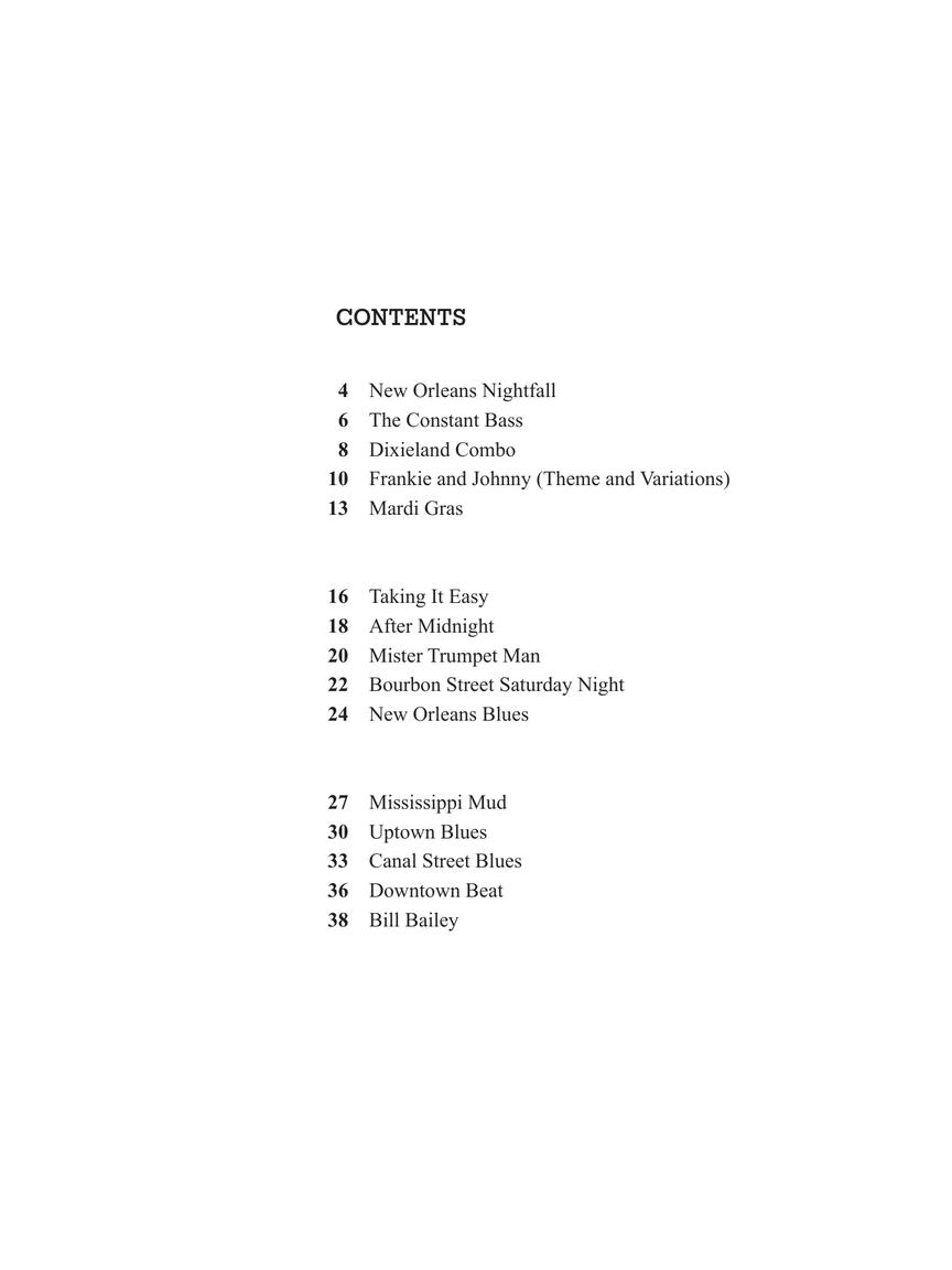 15 canções da série clássica New Orleans Jazz Styles de Gillock adaptadas para piano. Títulos: After Midnight • Bill Bailey • Bourbon Street Saturday Night • Canal Street Blues • The Constant Bass • Dixieland Combo • Downtown Beat • Frankie and Johnny (Theme and Variations) • Mardi Gras • Mississippi Mud • Mister Trumpet Man • New Orleans Blues • New Orleans Nightfall • Taking It Easy • Uptown Blues.