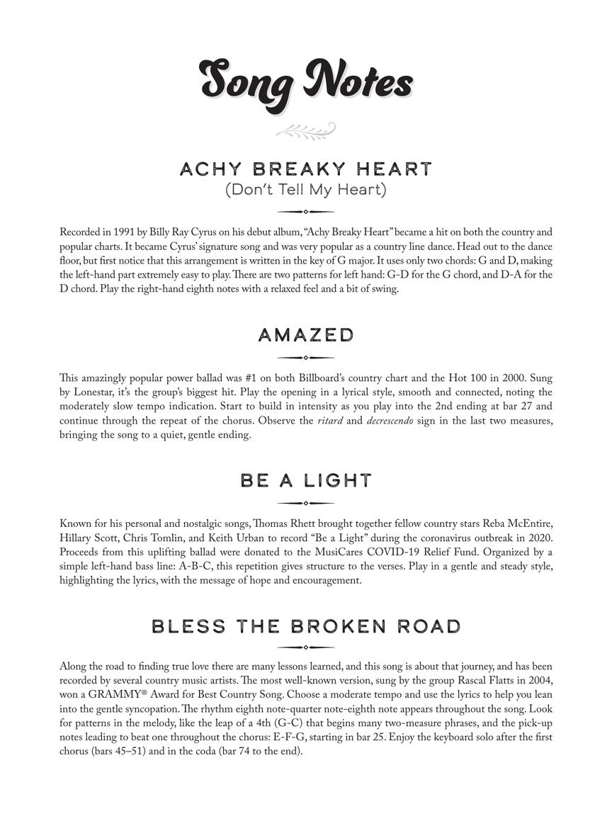 Now kids can confidently play 25 favorite country songs right away! This collection of easy piano arrangements features simple melody lines and accompaniment patterns that are easy to read, as well as song notes and practice tips for each song.