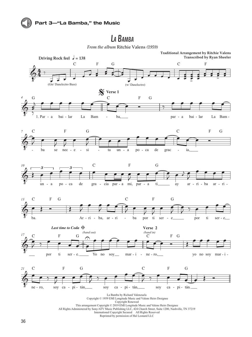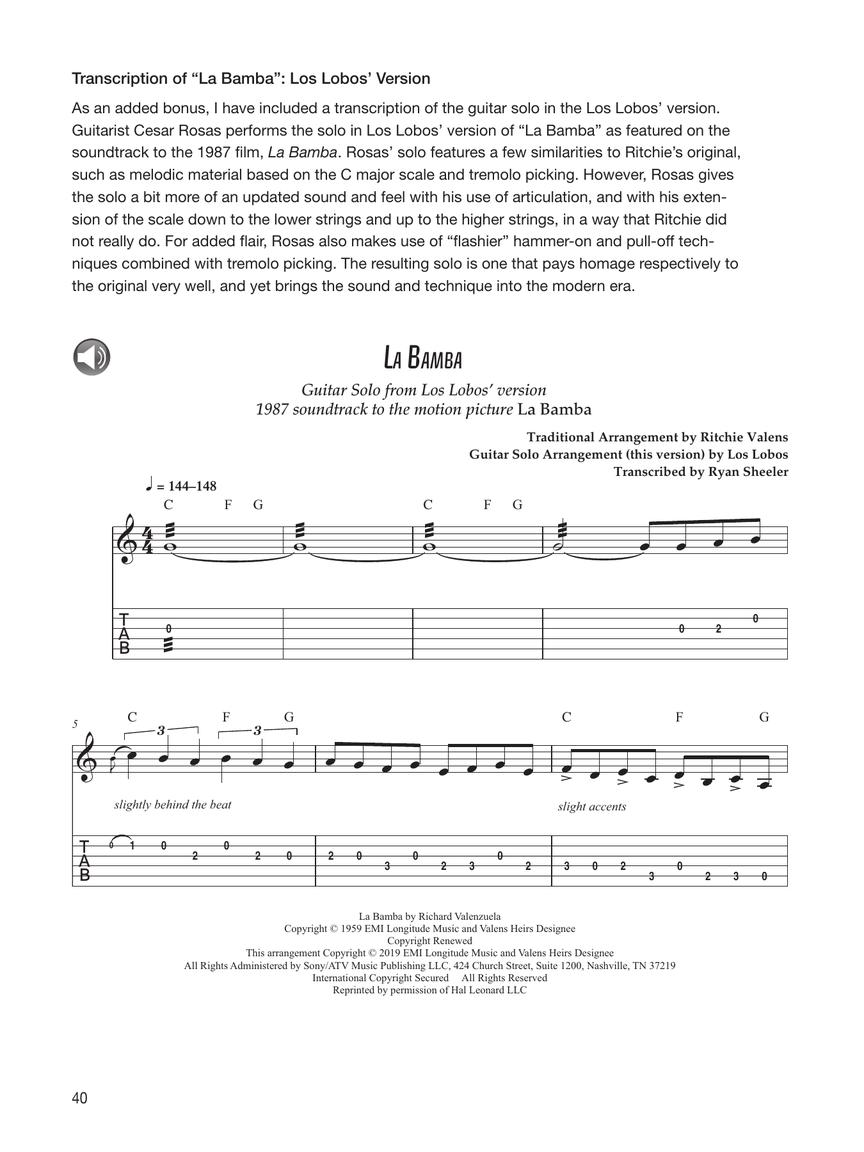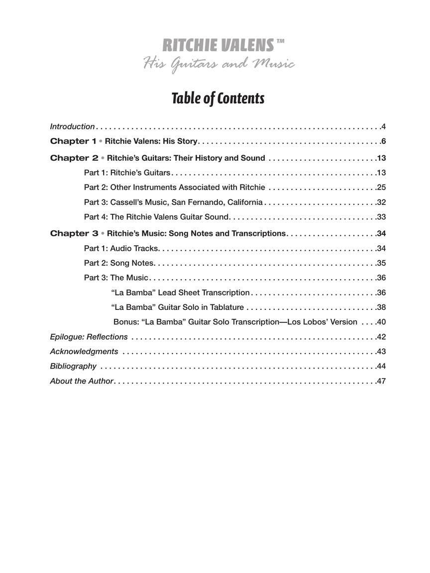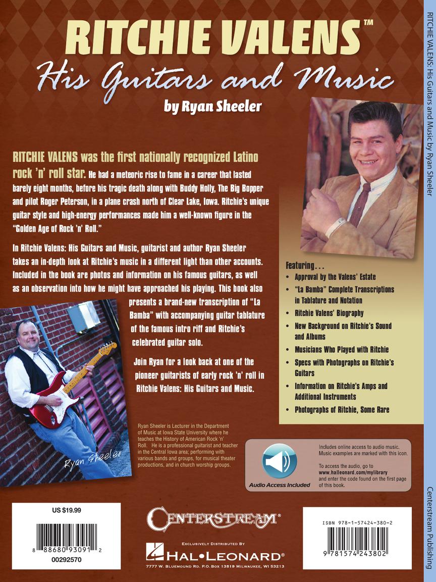 In Ritchie Valens: His Guitars and Music, guitarist and author Ryan Sheeler takes an in-depth look at Ritchie's music in a different light than other accounts. Included in the book are photos and information on his famous guitars, as well as an observation into how he might have approached his playing. This book also presents a brand-new transcription of “La Bamba” with accompanying guitar tablature of the famous intro riff and Ritchie's celebrated guitar solo.