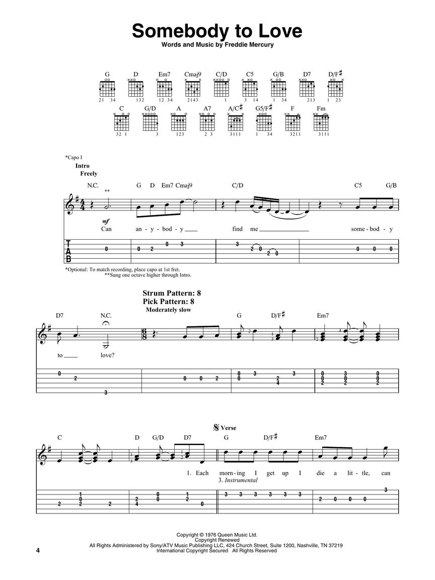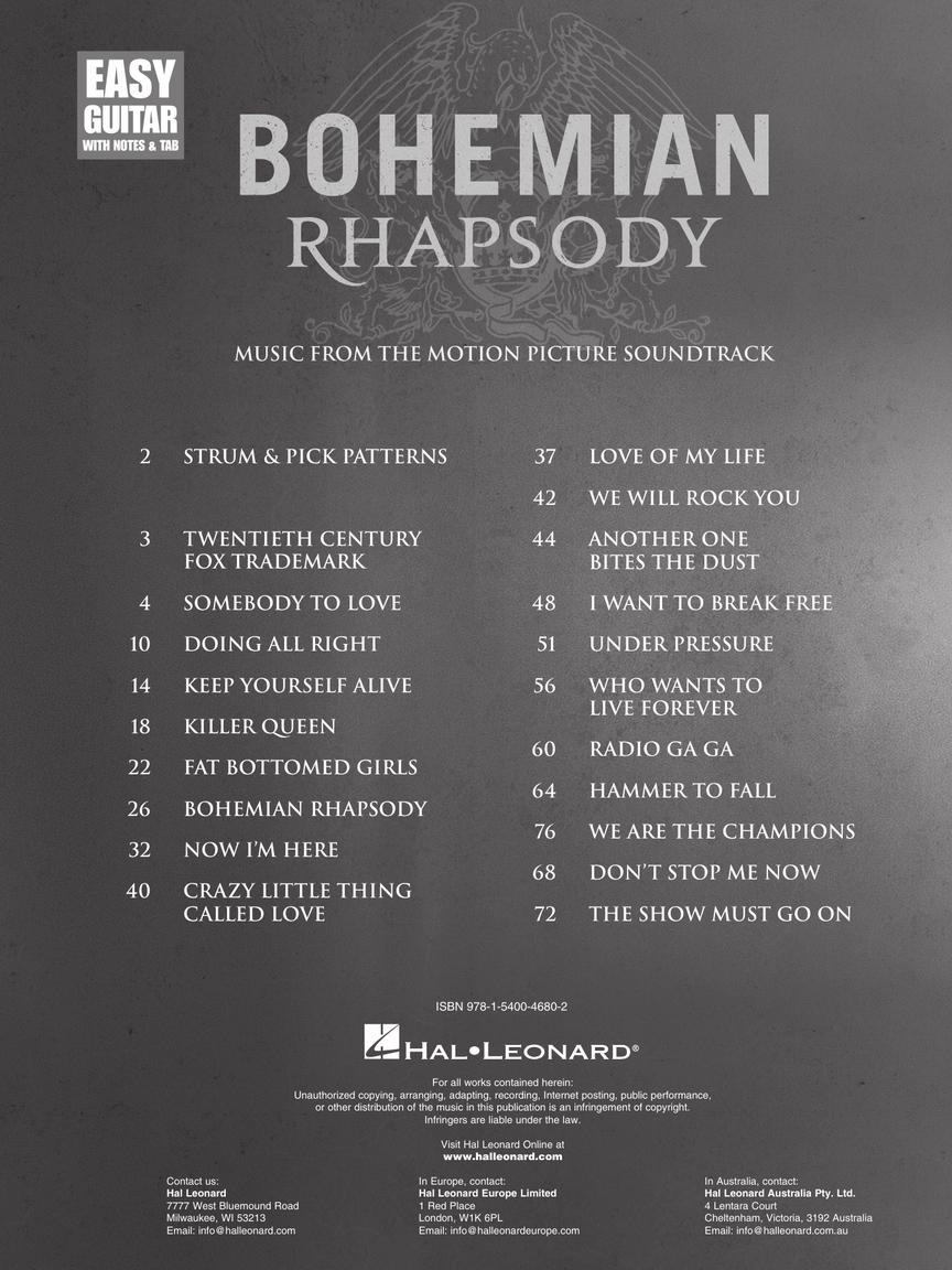 15 songs from the motion picture soundtrack transcribed for easy guitar – you even get Brian May's awesome rendition of the Twentieth Century Fox trademark fanfare! In addition, it includes: Another One Bites the Dust • Bohemian Rhapsody • Crazy Little Thing Called Love • Keep Yourself Alive • Killer Queen • The Show Must Go On • Somebody to Love • Under Pressure • We Are the Champions • We Will Rock You • and more.