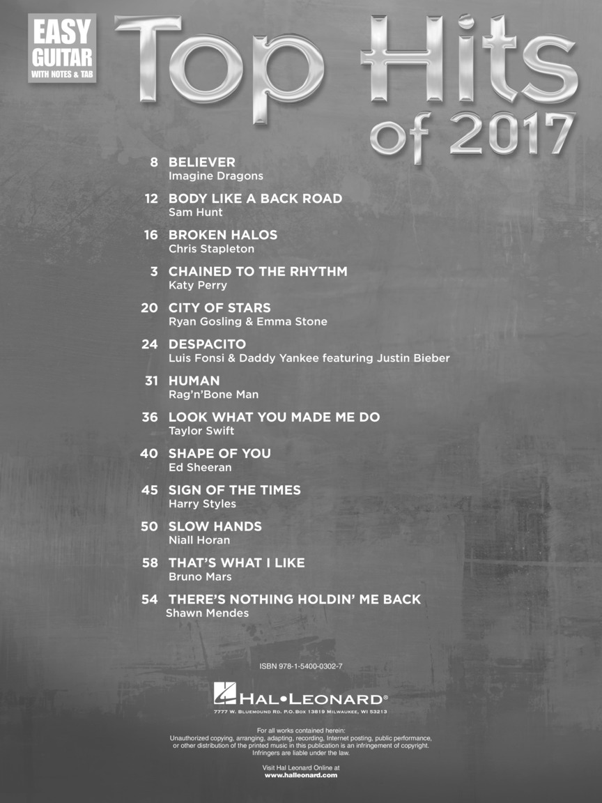Guitarristas iniciantes podem tocar as músicas mais populares do ano com esta coleção de 13 arranjos de guitarra fáceis com notas e tabulação e letras completas. As músicas incluem: Believer • Body like a Back Road • Broken Halos • Chained to the Rhythm • City of Stars (from La La Land) • Despacito • Human • Look What You Made Me Do • Shape of You • Sign of the Times • Slow Hands • That's What I Like • There's Nothing Holdin' Me Back.