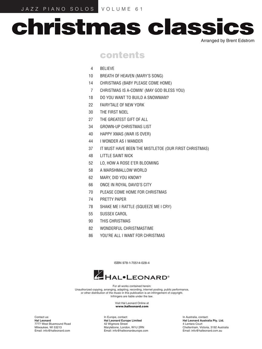 24 divertidos arranjos de férias cheios de jazz completos com símbolos de acordes, incluindo: Believe • Christmas (Baby Please Come Home) • Do You Want to Build a Snowman? • Fairytale of New York • Happy Xmas (War Is Over) • Mary, Did You Know? • Please Come Home for Christmas • Wonderful Christmastime • You're All I Want for Christmas • e outras.