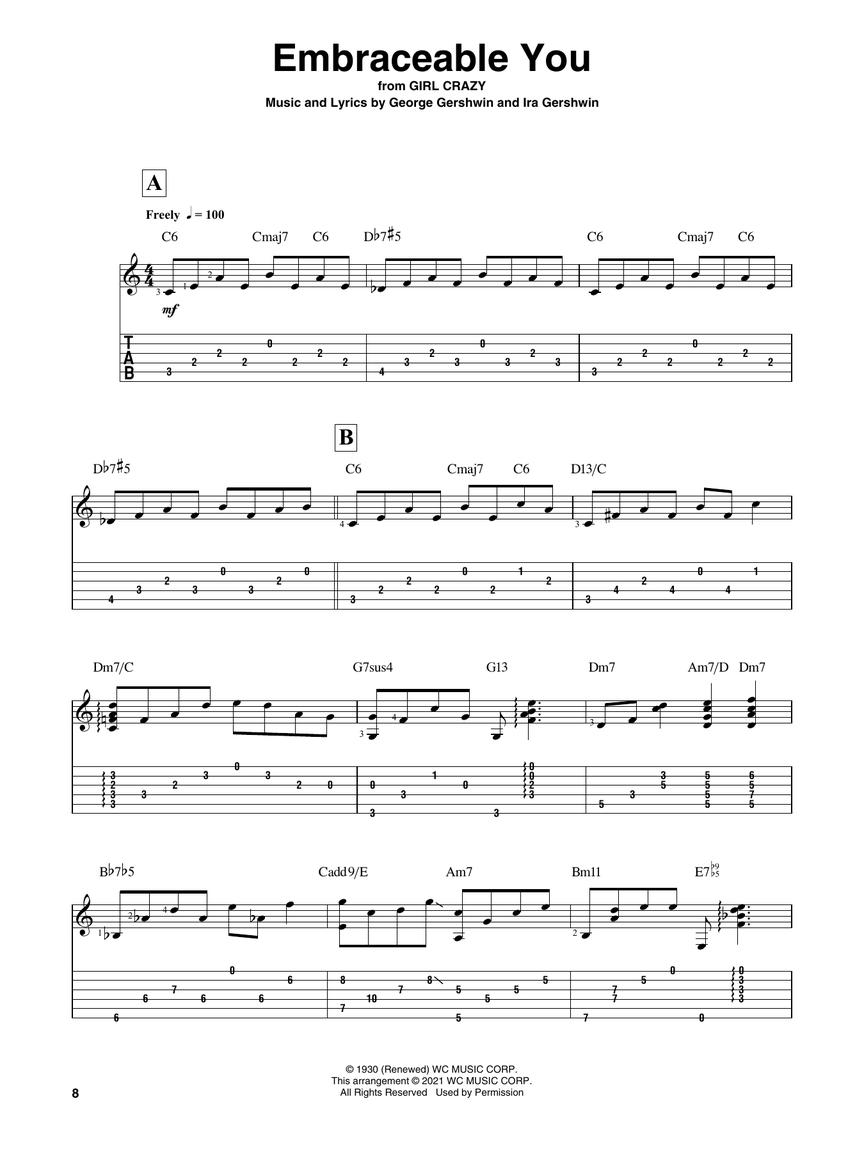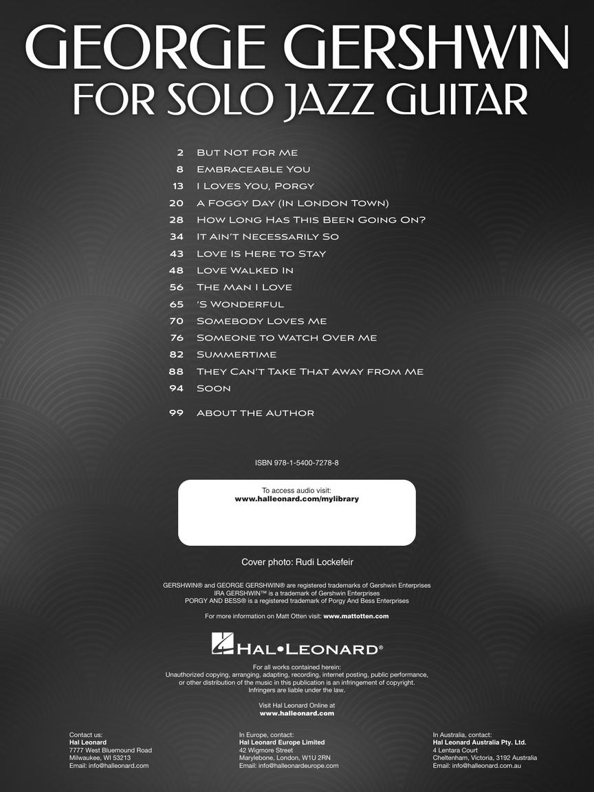 Matt Otten has arranged 15 Gershwin classics in standard notation and tablature for jazz guitar in the chord-melody style in this collection. Songs include: But Not for Me • Embraceable You • I Loves You, Porgy • Love Is Here to Stay • Somebody Loves Me • Someone to Watch over Me • Summertime • They Can't Take That Away from Me • and more.