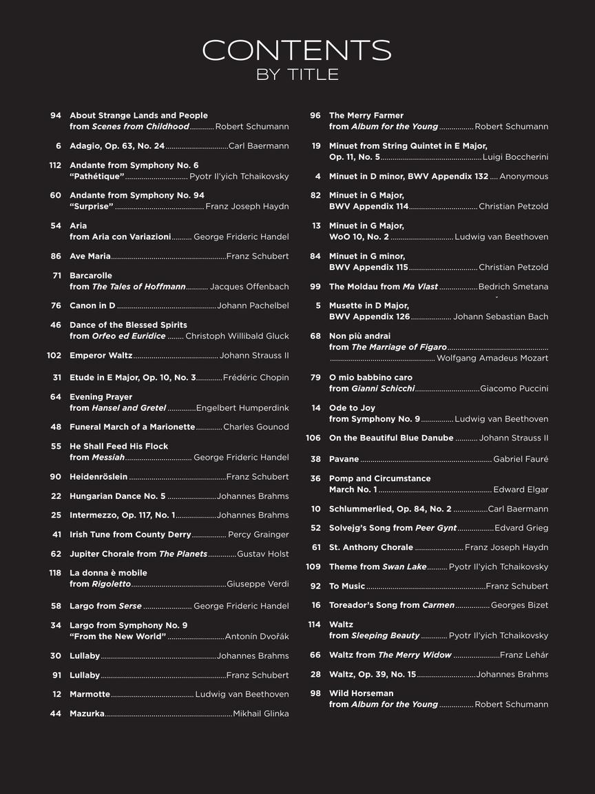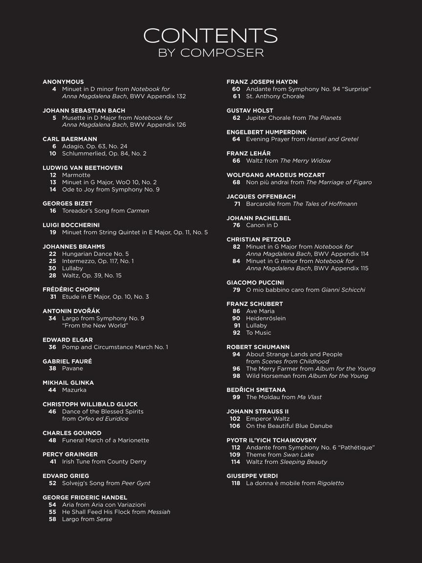 O conteúdo completo inclui: About Strange Lands and People from Scenes from Childhood (Schumann) • Adagio, Op. 63, No. 24 (Baermann) • Andante from Symphony No. 6 “Pathétique” (Tchaikovsky) • Andante from Symphony No. 94 “Surprise” (Haydn) • Aria from Aria con Variazioni (Handel) • Ave Maria (Schubert) • Barcarolle from The Tales of Hoffmann (Offenbach) • Canon in D (Pachelbel) • Dance of the Blessed Spirits from Orfeo ed Euridice (Gluck) • Emperor Waltz (Strauss) • Etude in E Major, Op. 10, No. 3 (Chopin) • Evening Prayer from Hansel and Gretel (Humperdink) • Funeral March of a Marionette (Gounod) • He Shall Feed His Flock from Messiah (Handel) • Heidenröslein (Schubert) • Hungarian Dance No. 5 (Brahms) • Intermezzo, Op. 117, No. 1 (Brahms) • Irish Tune from County Derry (Grainger) • Jupiter Chorale from The Planets (Holst) • La donna è mobile from Rigoletto (Verdi) • Largo from Serse (Handel) • Largo from Symphony No. 9 “From the New World” (Dvorák) • Lullaby (Brahms) • Lullaby (Schubert) • Marmotte (Beethoven) • Mazurka (Glinka) • The Merry Farmer from Album for the Young (Schumann) • Minuet from String Quintet in E Major, Op. 11, No. 5 (Boccherini) • Minuet in D minor, BWV Appendix 132 (Anonymous) • Minuet in G Major, BWV Appendix 114 (Petzold) • Minuet in G Major, WoO 10, No. 2 (Beethoven) • Minuet in G minor, BWV Appendix 115 (Petzold) • The Moldau from Ma Vlast (Smetana) • Musette in D Major, BWV Appendix 126 (Bach) • Non più andrai from The Marriage of Figaro (Mozart) • O mio babbino caro from Gianni Schicchi (Puccini) • Ode to Joy from Symphony No. 9 (Beethoven) • On the Beautiful Blue Danube (Strauss) • Pavane (Fauré) • Pomp and Circumstance March No. 1 (Elgar) • Schlummerlied, Op. 84, No. 2 (Baermann) • Solvejg's Song from Peer Gynt (Grieg) • St. Anthony Chorale (Haydn) • Theme from Swan Lake (Tchaikovsky) • To Music (Schubert) • Toreador's Song from Carmen (Bizet) • Waltz from Sleeping Beauty (Tchaikovsky) • Waltz from The Merry Widow (Lehár) • Waltz, Op. 39, No. 15 (Brahms) • Wild Horseman from Album for the Young (Schumann).