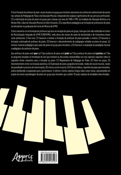 O livro Formação do professor de piano: ensino de piano em grupo para iniciantes representa uma síntese do conhecimento da autora nos campos da Pedagogia do Piano e da Educação Musical, integrando dois espaços significativos de seu percurso profissional: (1) a ministração de aulas de piano em grupo para crianças nos anos de 1980 e 1990, na Fundação de Educação Artística e no Núcleo Villa-Lobos de Educação Musical em Belo Horizonte; (2) a experiência pedagógica na formação de professores de piano em disciplinas na graduação da Escola de Música da UFMG.