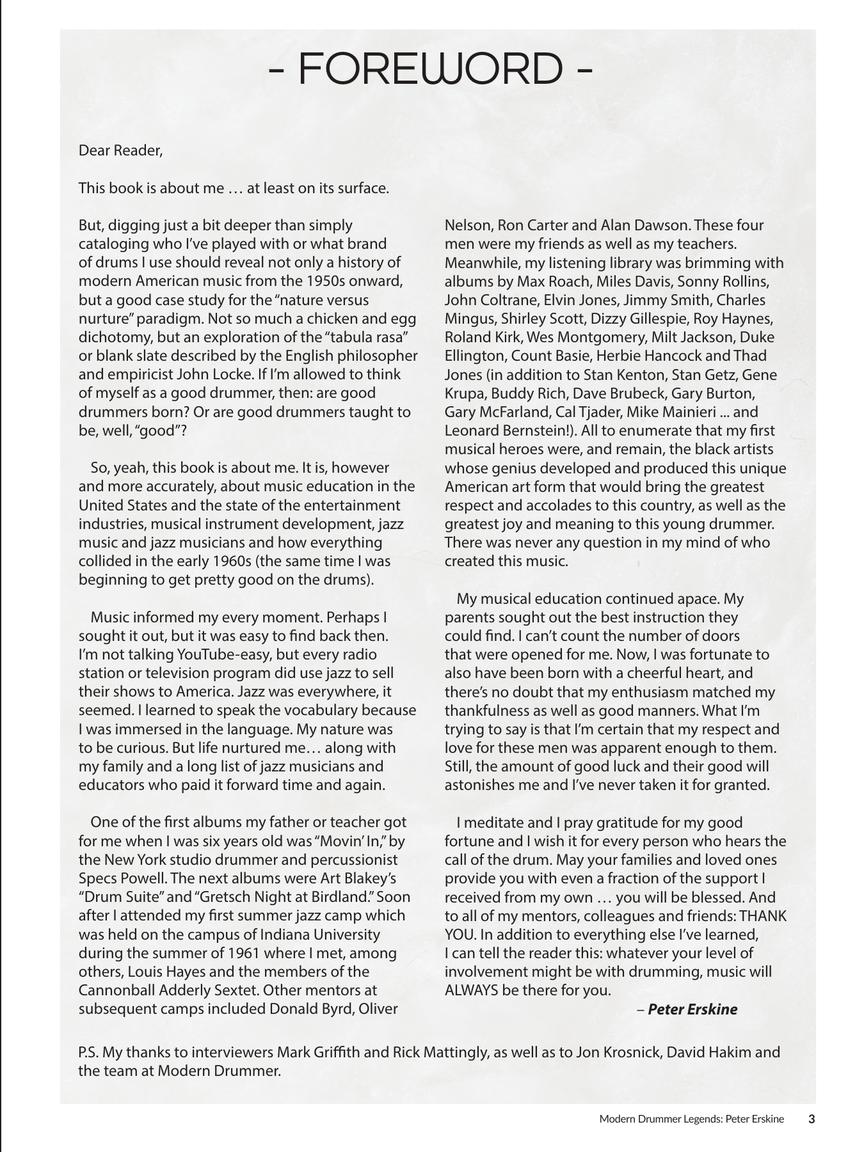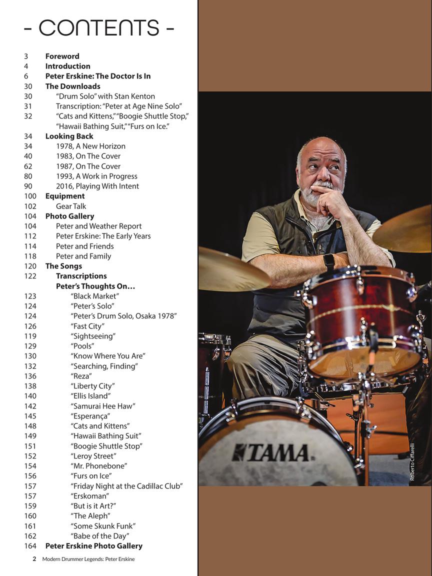 The sixth installment in the Modern Drummer Legends series contains 80 pages of extensive and in-depth interviews, exclusive Erskine recordings, pictorials of Weather Report, Peter and Friends, the early years, Peter's analysis and insights on 40+ pages of drum transcriptions, and a great digital download component.