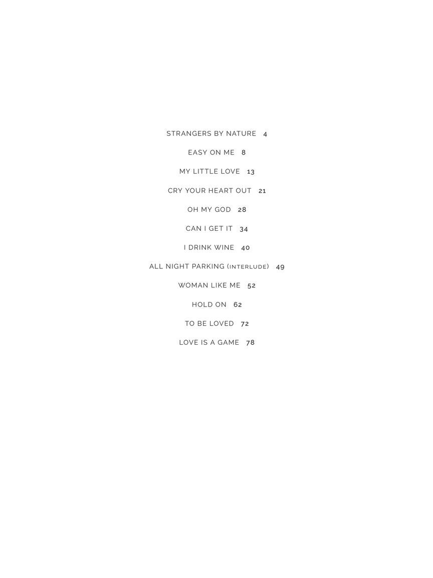 Our matching folio to Adele's long-awaited fourth album features all the tracks arranged for piano/vocal/guitar including: All Night Parking (Interlude) • Can I Get It • Can't Be Together • Cry Your Heart Out • Easy on Me • Hold On • I Drink Wine • Love Is a Game • My Little Love • Oh My God • Strangers by Nature • To Be Loved • Wild Wild West • Woman like Me.