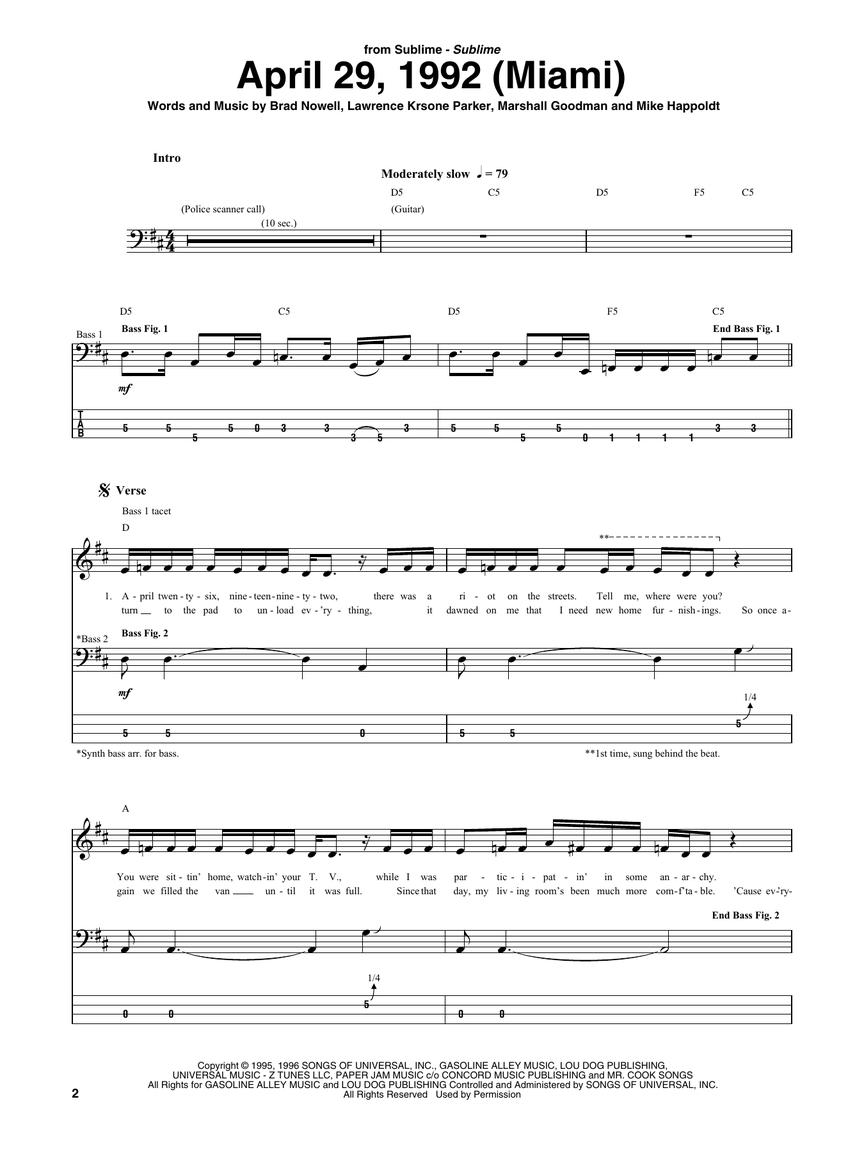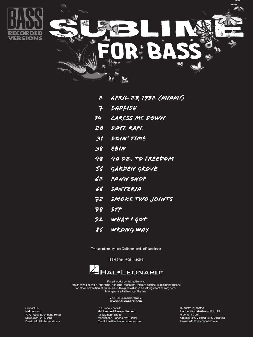 This folio features transcriptions of Eric Wilson's basslines for 14 Sublime favorites, including: April 29, 1992 (Miami) • Badfish • Caress Me Down • Date Rape • Doin' Time • Ebin • 40 Oz. to Freedom • Garden Grove • Pawn Shop • Santeria • Smoke Two Joints • STP • What I Got • Wrong Way.