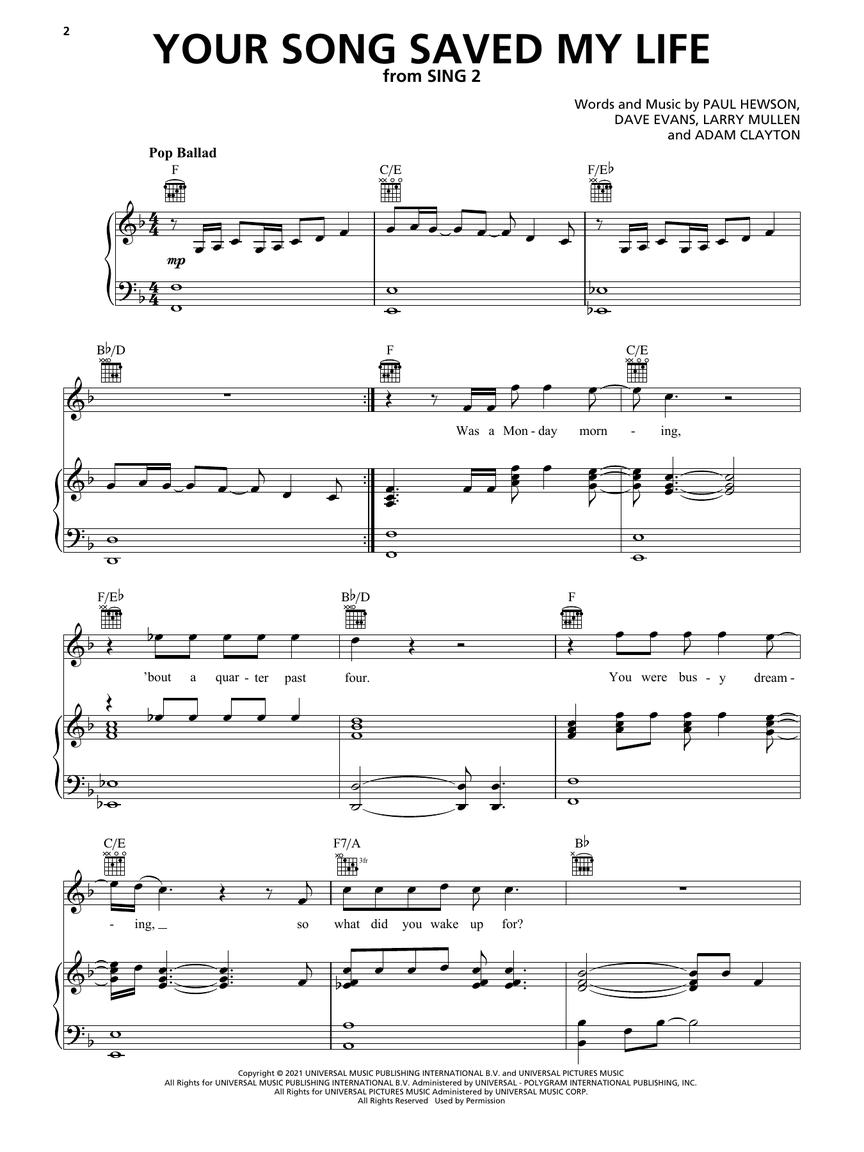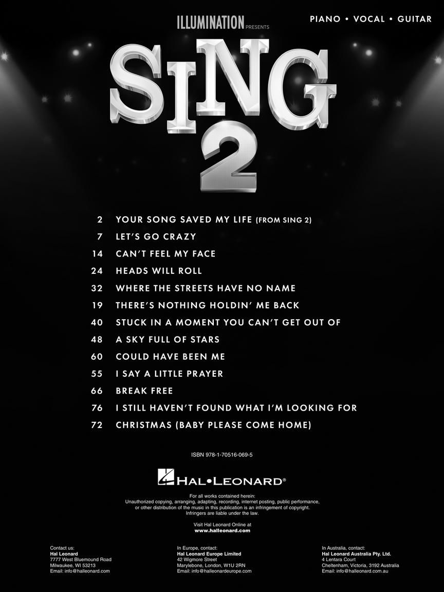 Buster Moon and his all-star cast of animal performers are back to demonstrate the power of music to heal even the most broken heart. The much-anticipated follow-up to Sing was released in December, 2021, and features a soundtrack full of more big fun hits. Our matching folio features piano/vocal/guitar arrangements of 13 songs, including: Can't Feel My Face • Christmas (Baby Please Come Home) • I Say a Little Prayer • I Still Haven't Found What I'm Looking For • Let's Go Crazy • A Sky Full of Stars • Stuck in a Moment You Can't Get Out Of • Where the Streets Have No Name • Your Song Saved My Life •