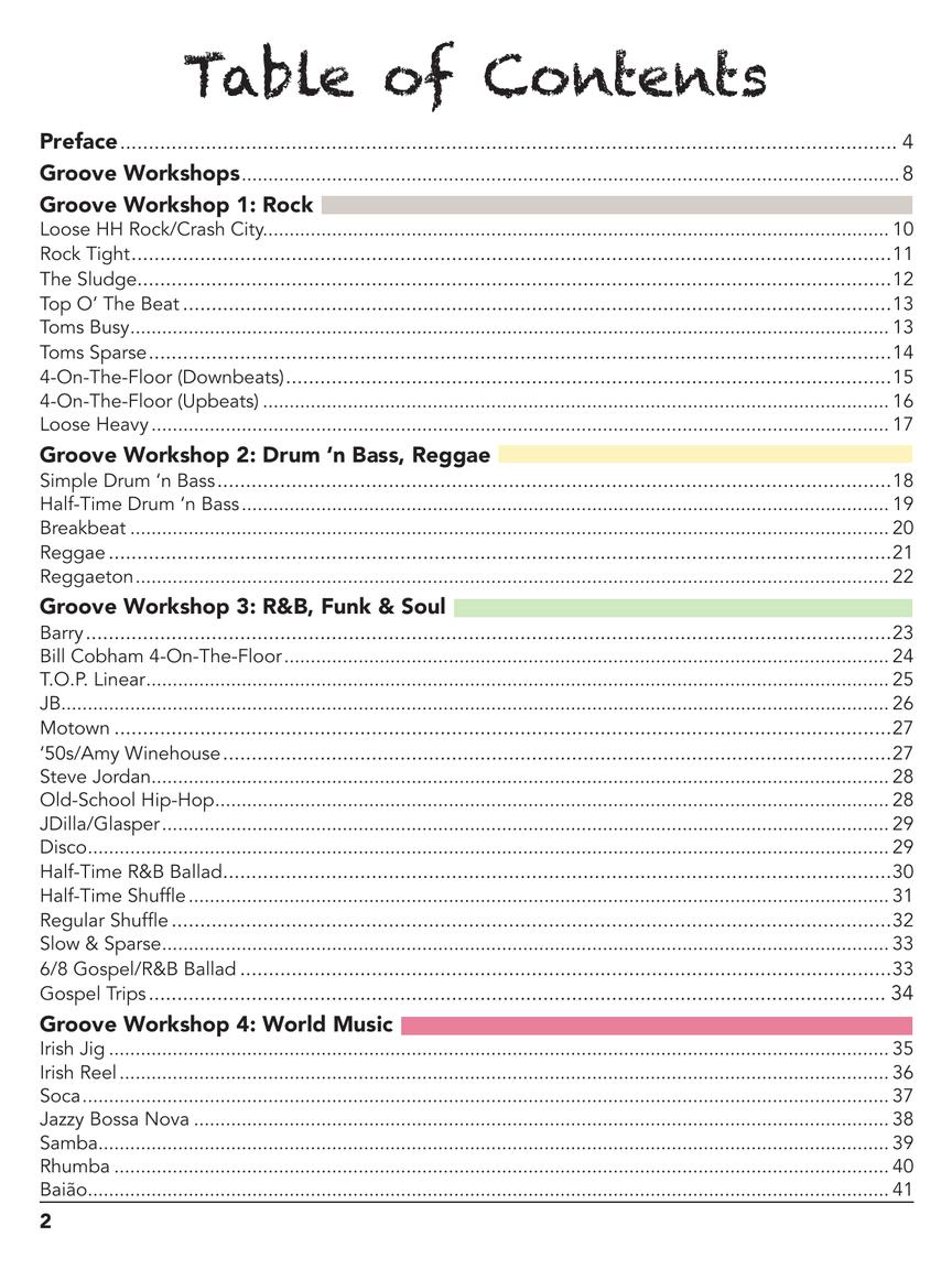 All of the material presented comes from the author's real-world experience in recording sessions and band situations. Based around “Groove Workshops” that include 53 bass/drums groove play-alongs, styles explored include rock, drum'n'bass, R&B/soul, reggae, World, roots, blues, jazz, odd time, and more. Within these styles, specific substyles and classic influences are examined, with grooves and rhythm section approaches used by Billy Cobham, James Brown, Steve Jordan, David Garibaldi, J Dilla, Robert Glasper, Art Blakey, and many others. Other substyles studied include bluegrass, New Orleans Second Line, boogaloo, blues, various shuffles, grungy rock, jazz brushes, and much more.