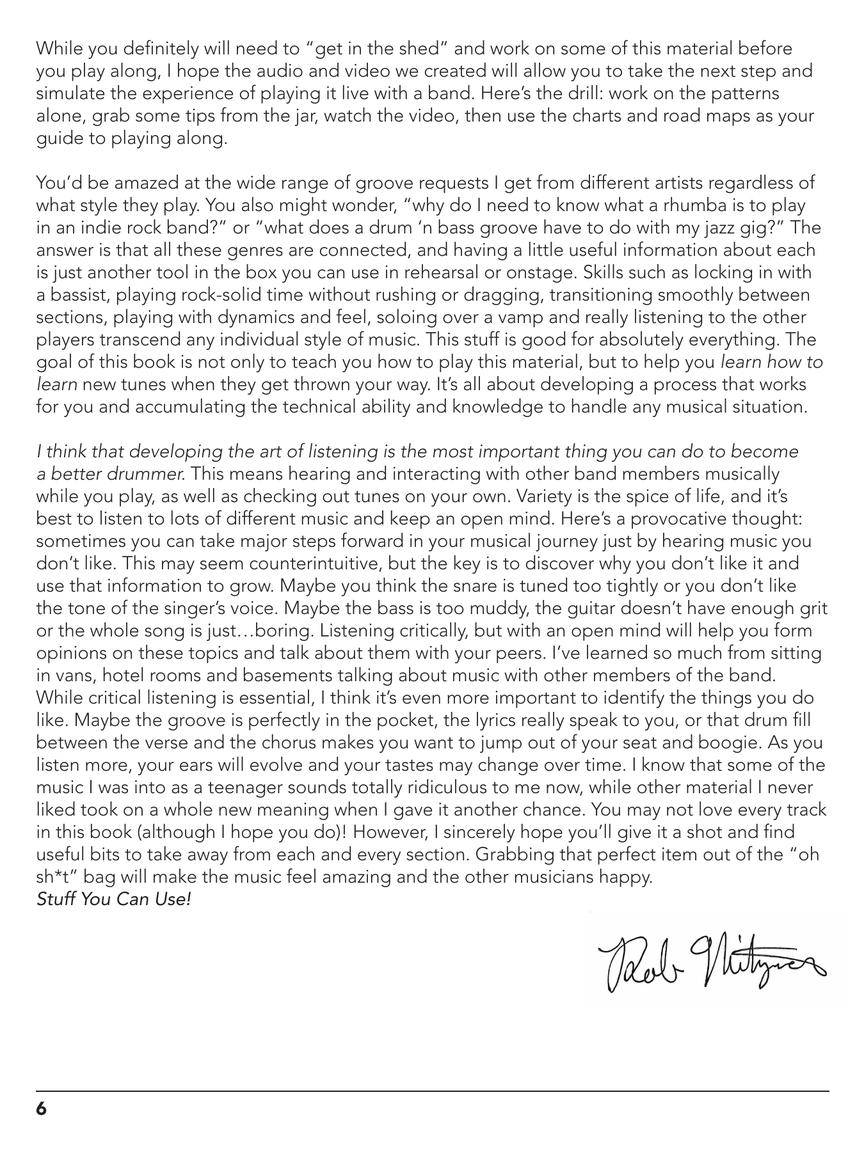 Audio files with and without drums are included for every groove, along with detailed charts, transcriptions, road maps and lead sheets. There is also a section on how to make your own charts. There is video and analysis for every track, with interviews, anecdotes, and pro tips for the drummer from all the various musicians.