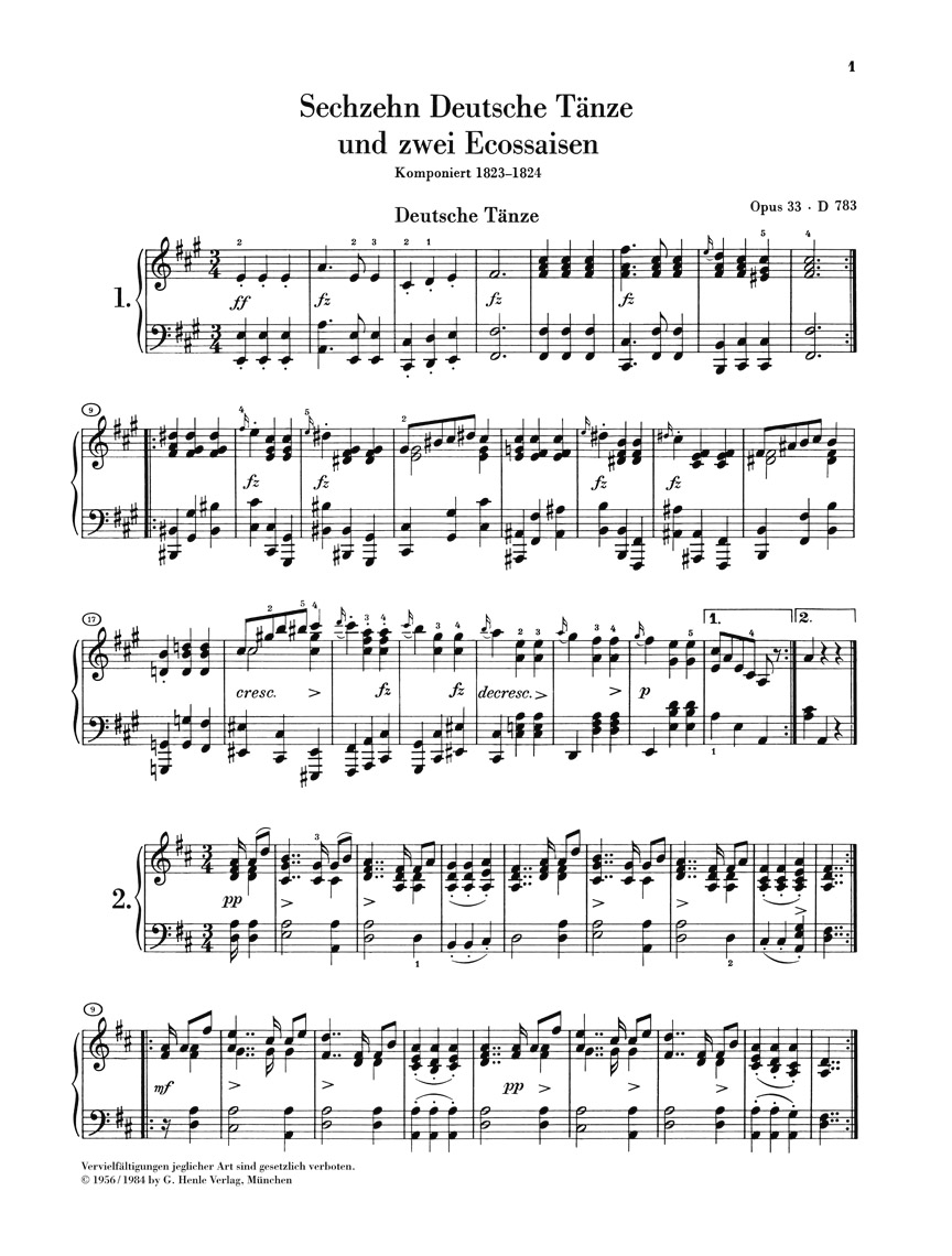 Schubert at the piano, his inexhaustible wealth of dance melodies, his friends gathered around him, dancing, amusing themselves – making music was an important aspect in the lives of Schubert and his friends. The term Schubertiade invented for this kind of get-together is now solidly established.Of his more than 300 dance pieces for piano, no fewer than eight collections with altogether 177 single pieces were printed during his lifetime, including these 16 Deutsche Tänze and two Ecossaisen from 1823/24.