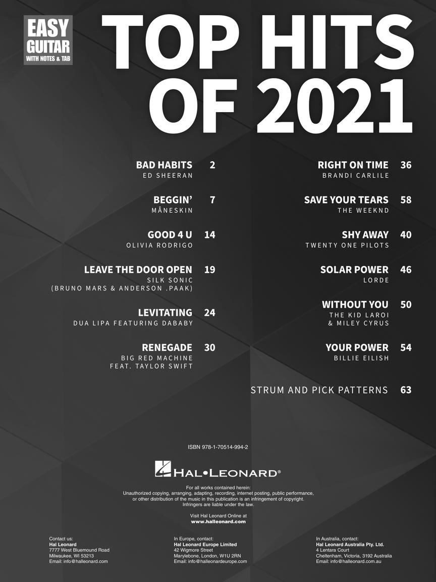 Uma dúzia dos melhores arranjos do ano para guitarra fácil com notas e tablatura. Inclui: Bad Habits (Ed Sheeran) • Beggin' (Maneskin) • good 4 u (Olivia Rodrigo) • Leave the Door Open (Bruno Mars & Anderson Paak) • Levitating (Dua Lipa) • Save Your Tears (The Weeknd) • Without You (The Kid Laroi) • Your Power (Billie Eilish) • e outras.