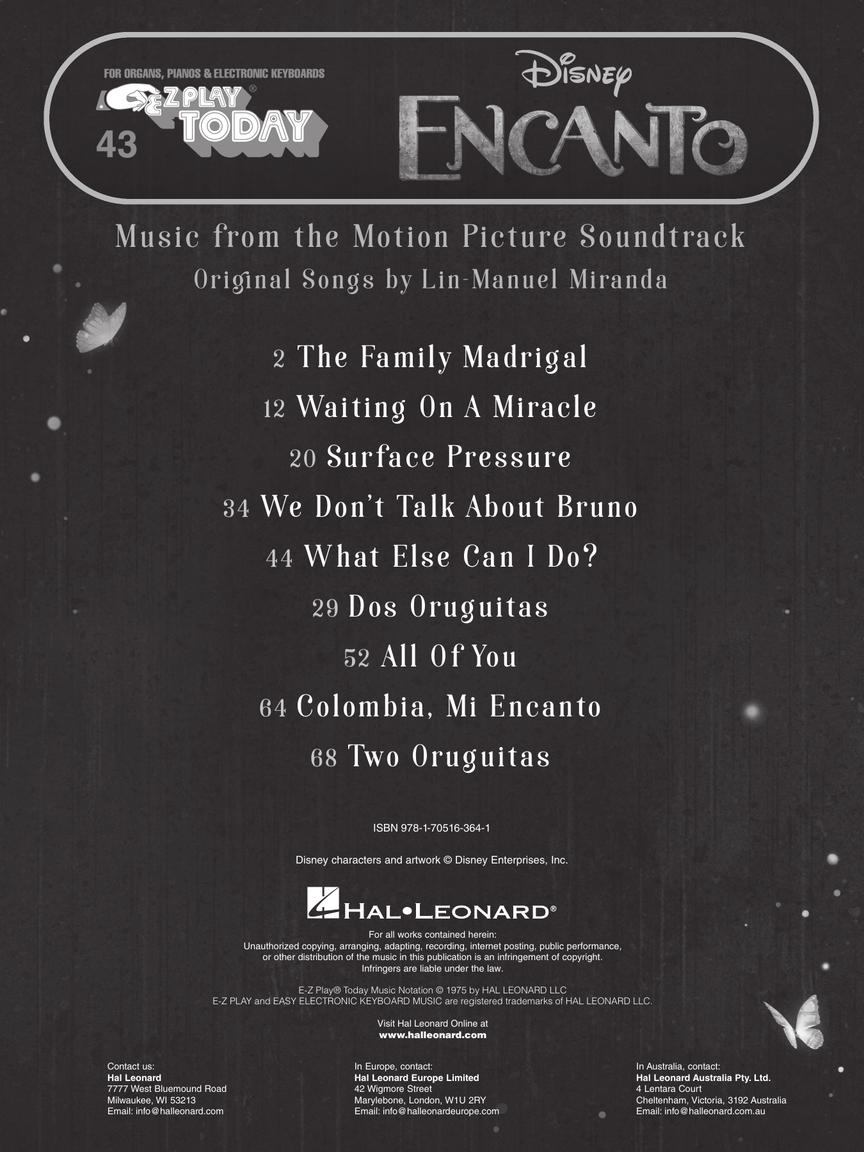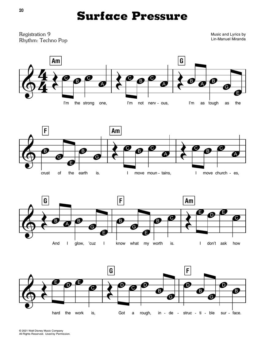 Arranjos super facilitados para piano/teclado: Incluindo: All of You • Colombia, Mi Encanto • Dos Oruguitas • The Family Madrigal • Surface Pressure • Two Oruguitas • Waiting on a Miracle • We Don't Talk About Bruno • What Else Can I Do?