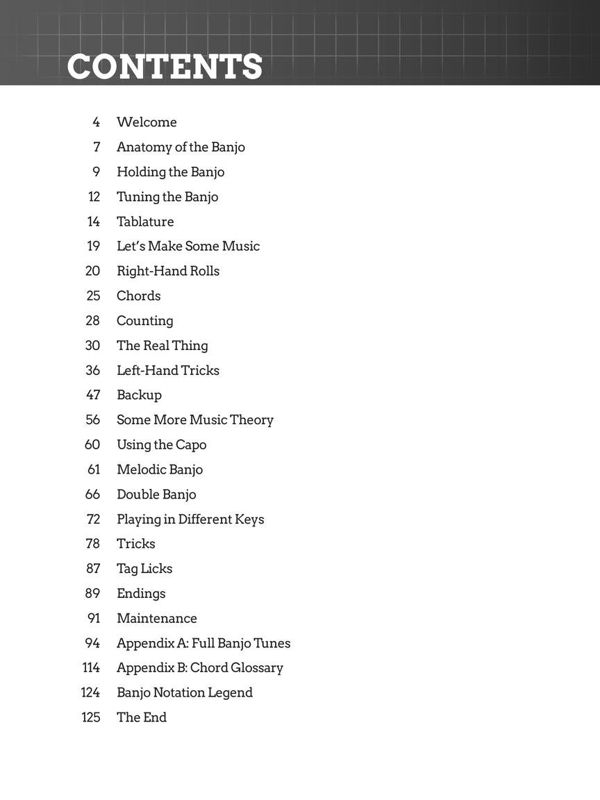 Inclui: fundamentos do banjo; leitura de tablatura de banjo; mão direita rolls; técnicas da mão esquerda; acordes; banjo melódico; usando um capo; tag licks e terminações; banjo manutenção; faixas de áudio de demonstração e play-along; instrução e demonstração em vídeo; e mais.