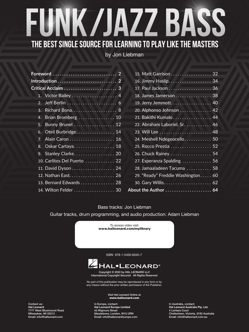 Após o sucesso de seus livros de técnicas de baixo orientados ao groove aclamados pela crítica, incluindo Funk Bass e Funk/Fusion Bass, Jon Liebman está de volta com uma coleção totalmente nova de grooves instrutivos funky - desta vez incluindo jazz! Você aprenderá a tocar com uma ampla variedade de expressões e nuances tanto no baixo com trastes quanto sem trastes, incorporando técnicas como slap, toque de acordes, ritmos sincopados e articulação de notas “mortas”. Acompanha mais de 45 minutos de vídeo online enquanto o autor apresenta novos grooves no estilo de 30 lendas do baixo escolhidas a dedo, permitindo que você analise como alguns dos maiores músicos de todos os tempos fizeram isso.