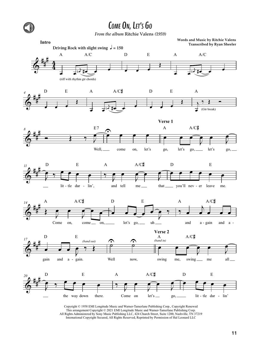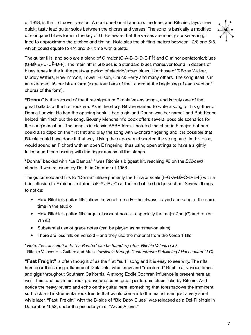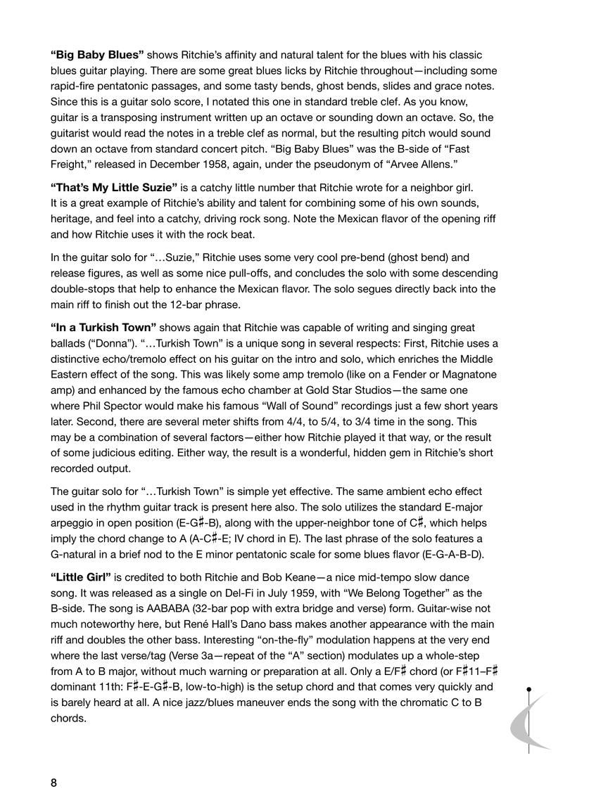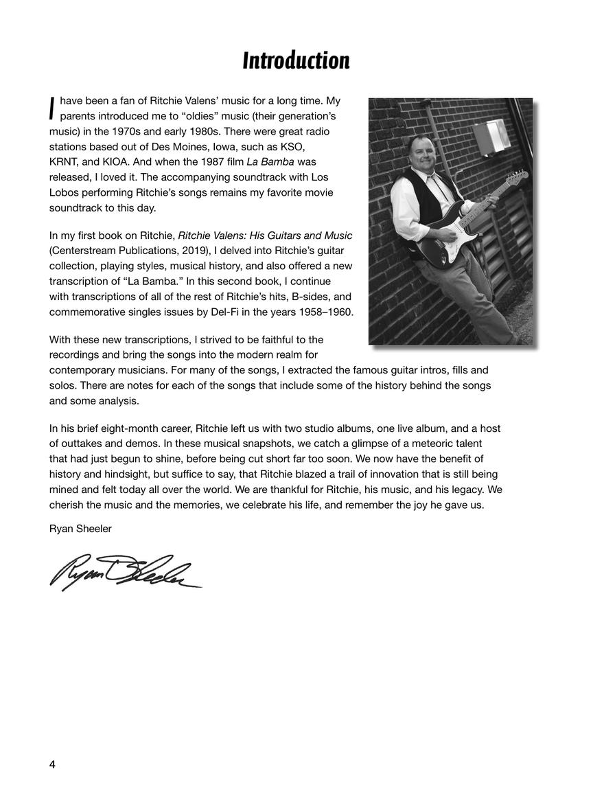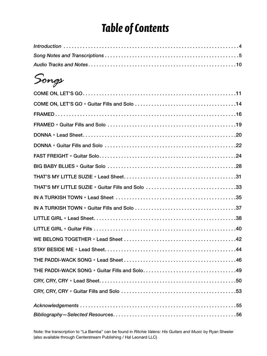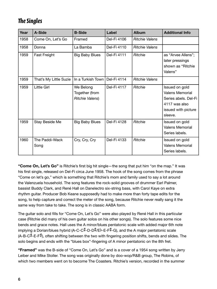 Valens had only two studio albums, Ritchie Valens and Ritchie, both released posthumously in 1959. In Ritchie Valens Songbook: Hits and B Sides, guitarist and author Ryan Sheeler presents an in-depth look at Ritchie's music from these two albums, featuring 12 note-for-note transcriptions with accompanying guitar tablature.