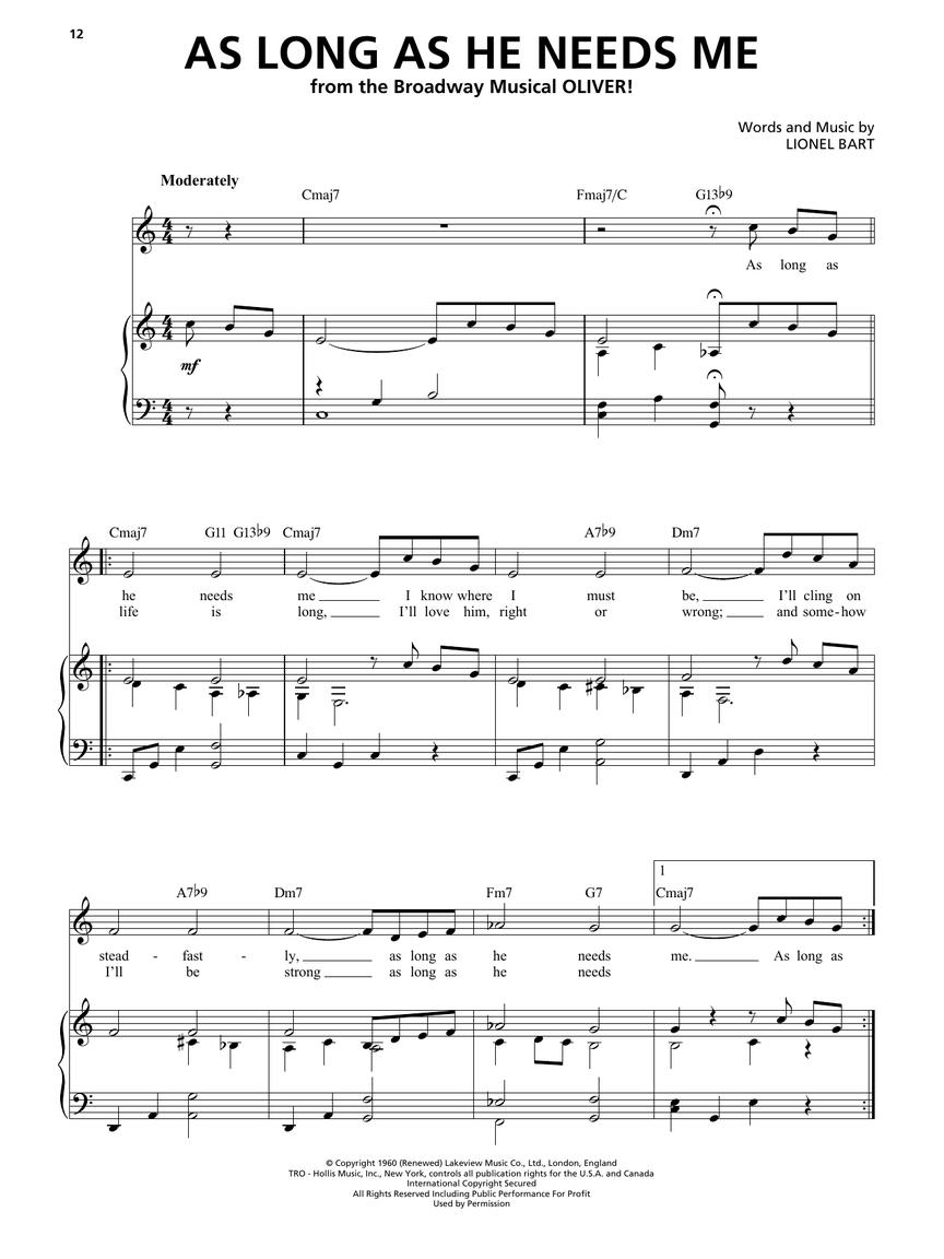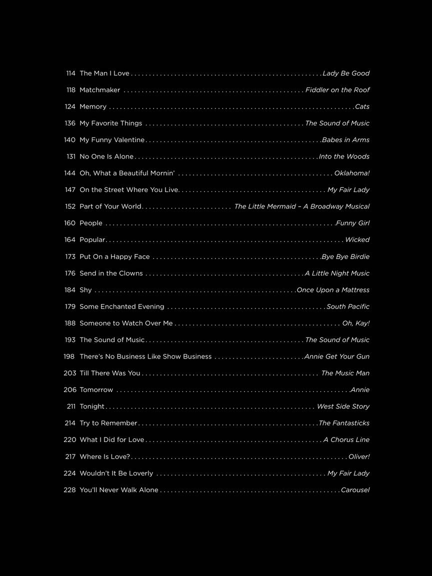 50 grandes clássicos da Broadway que todos os cantores de high voice deveriam ter em seus repertórios, incluindo: Anything Goes • Cabaret • Can't Help Lovin' Dat Man • Don't Cry for Me Argentina • For Good • I Could Have Danced All Night • I Dreamed a Dream • I Feel Pretty • The Man I Love • Memory • My Favorite Things • Part of Your World • People • Someone to Watch over Me • Tomorrow • What I Did for Love • Wouldn't It Be Loverly • e outras!