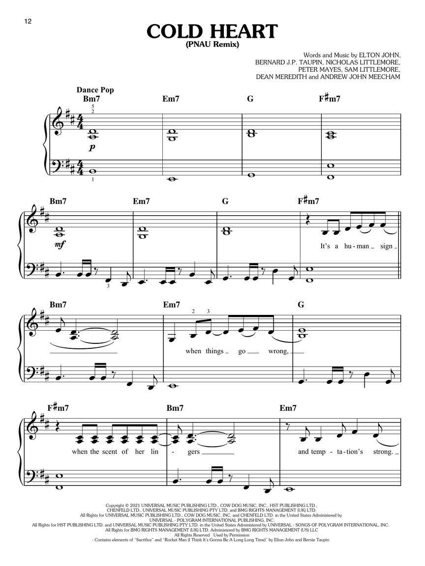 16 Canções de grande sucesso em 2021/2022 com arranjos facilitados para piano; Incluindo: All Too Well • Cold Heart (PNAU Remix) • Easy on Me • Fancy Like • Follow You • Ghost • Happier Than Ever • Heat Waves • If I Didn't Love You • It'll Be Okay • Love Again • My Universe • Permission to Dance • Shivers • Stay • We Don't Talk About Bruno.