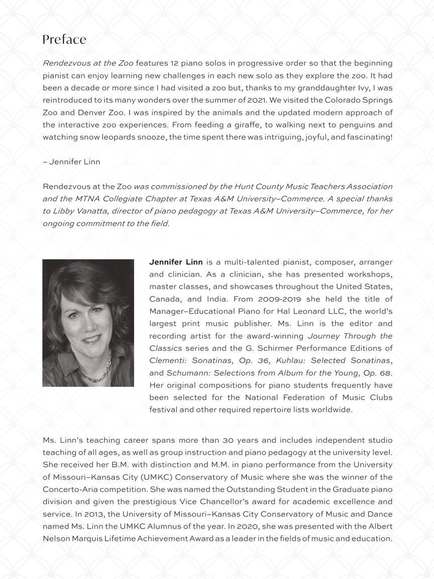 The Jennifer Linn Series features carefully leveled collections of either popular music arrangements or original compositions. The pieces or songs in each book are placed in a progressive order so students can learn new skills as they advance through the book. Written for piano students of all ages, there are five levels in the series: Early Bird (Pre-staff),Easy Elementary, Elementary+, Easy Intermediate, Intermediate+.