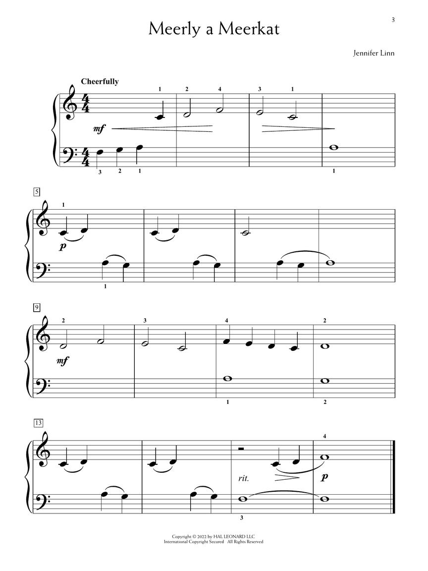 This edition features 12 delightful original works for young players who will love imagining the animals as they play! Titles include: Dance of the Jellyfish • Elephants on a Stroll • Feeding the Giraffes • Grizzly Bear Growl • Hippos' Muddy March • Meerly a Meerkat • and more.