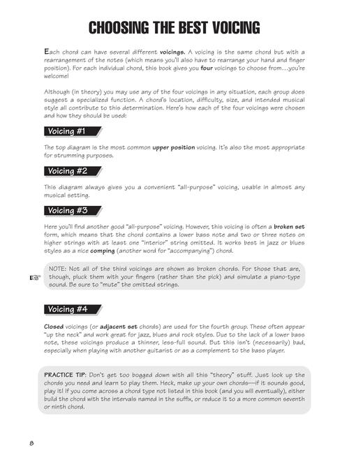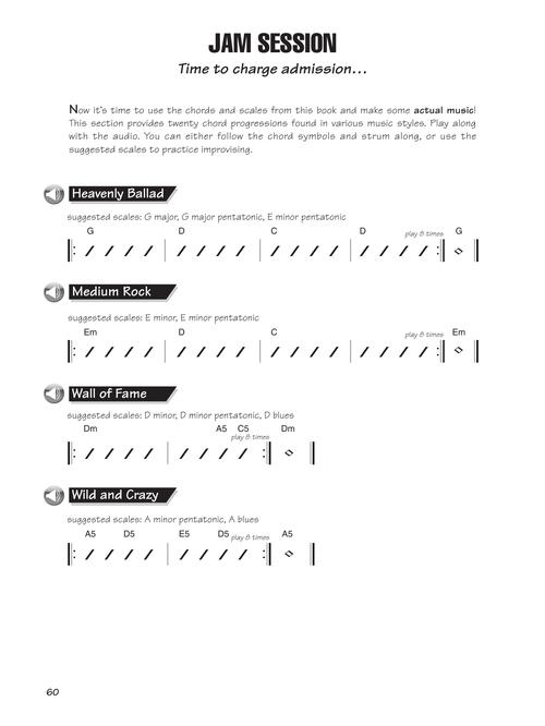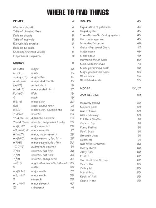 The fast way to find just the chord or scale you need. This user-friendly reference book is jam-packed with over 1,400 chords and voicings and includes a ″jam session″ with 20 original songs using common chord progressions. The cost of this book also includes access to online audio of all the examples.