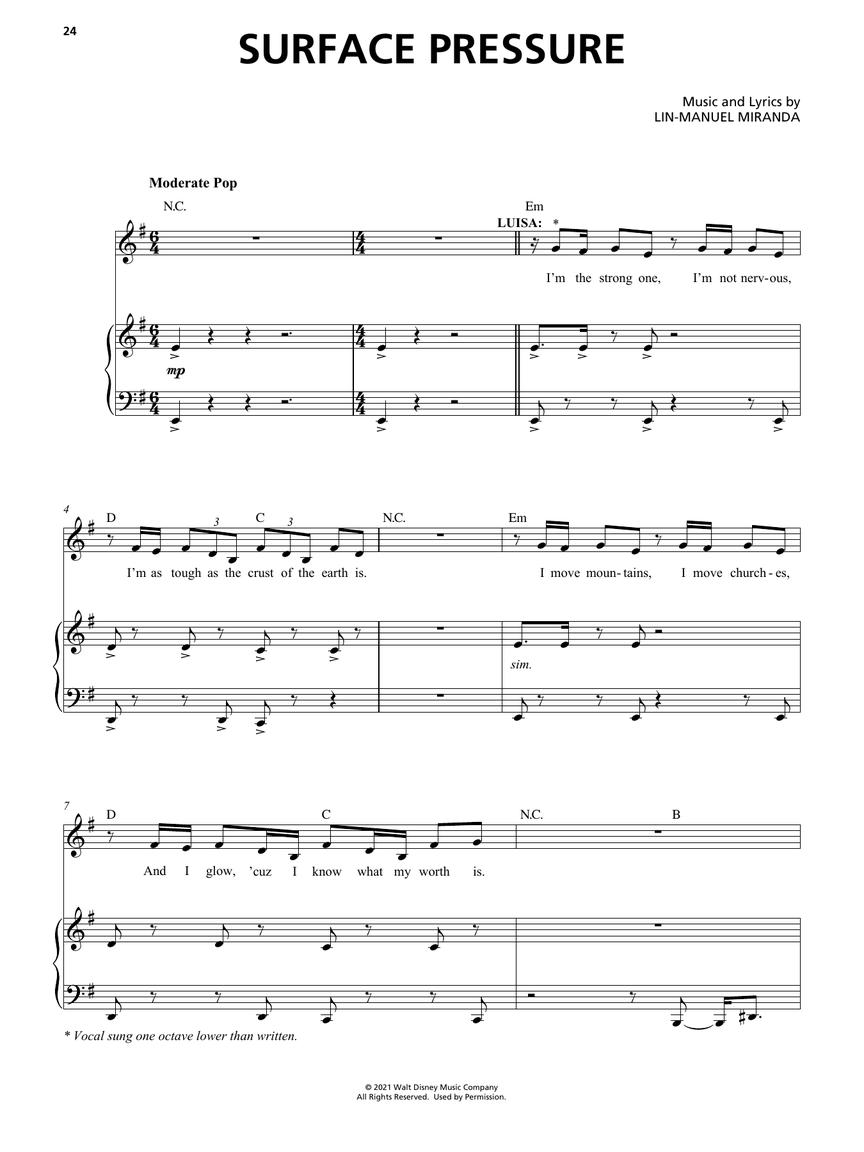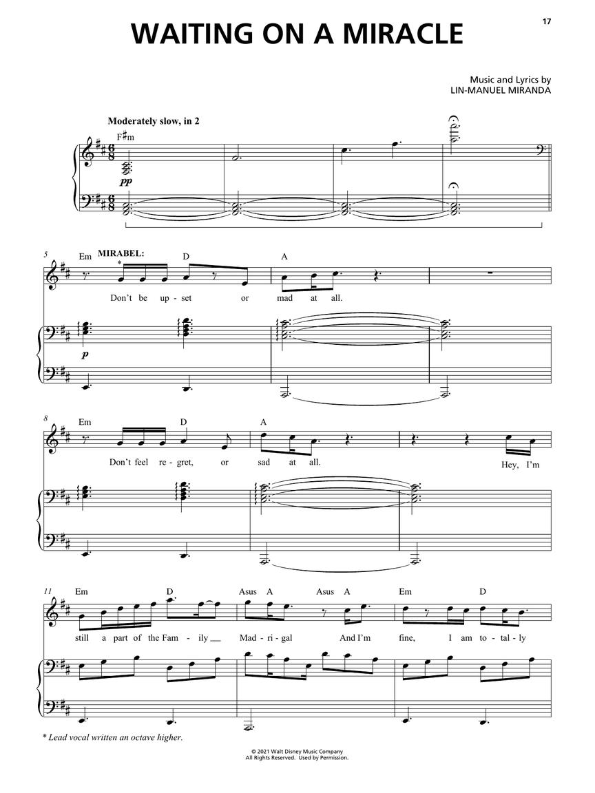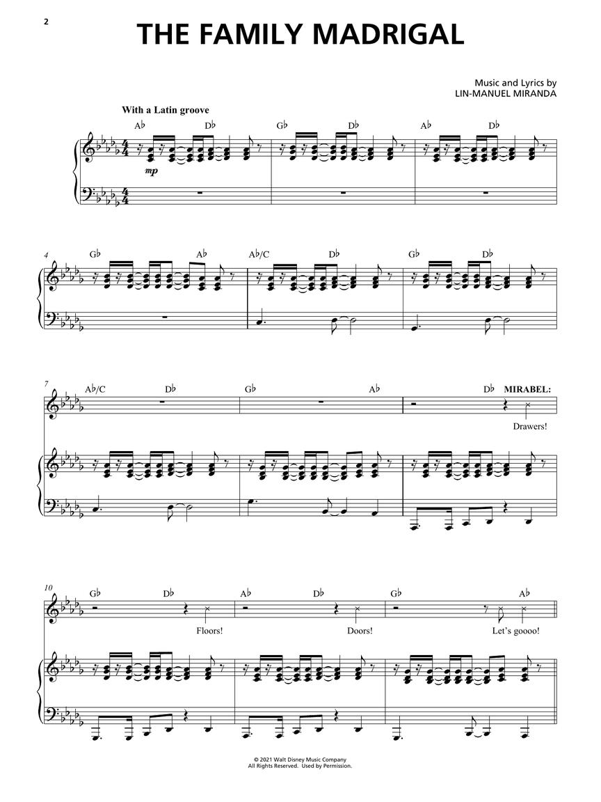 Arranjos para voz com acompanhamento de piano; incluindo: All of You • Colombia, Mi Encanto • Dos Oruguitas • The Family Madrigal • Surface Pressure • Two Oruguitas • Waiting on a Miracle • We Don't Talk About Bruno • What Else Can I Do?