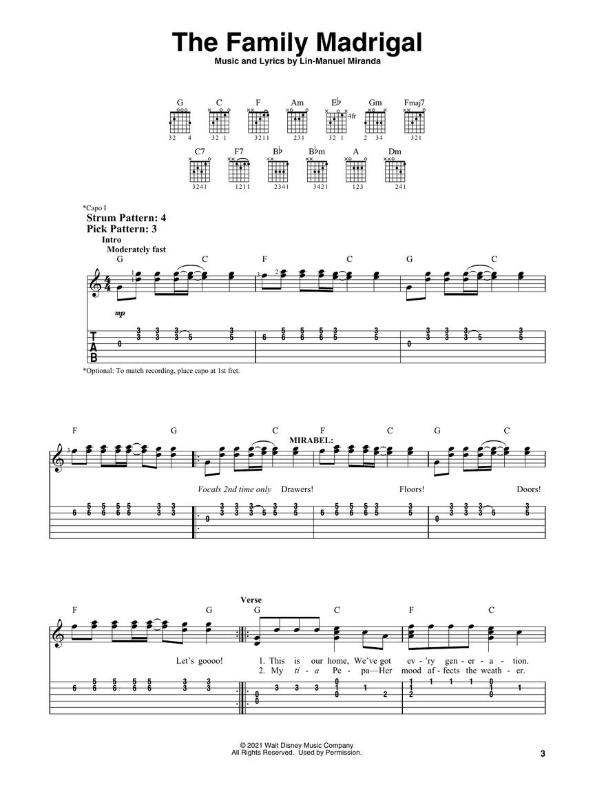 Arranjos facilitados para violão, na partitura e tablatura; incluindo: All of You • Colombia, Mi Encanto • Dos Oruguitas • The Family Madrigal • Surface Pressure • Two Oruguitas • Waiting on a Miracle • We Don't Talk About Bruno • What Else Can I Do?