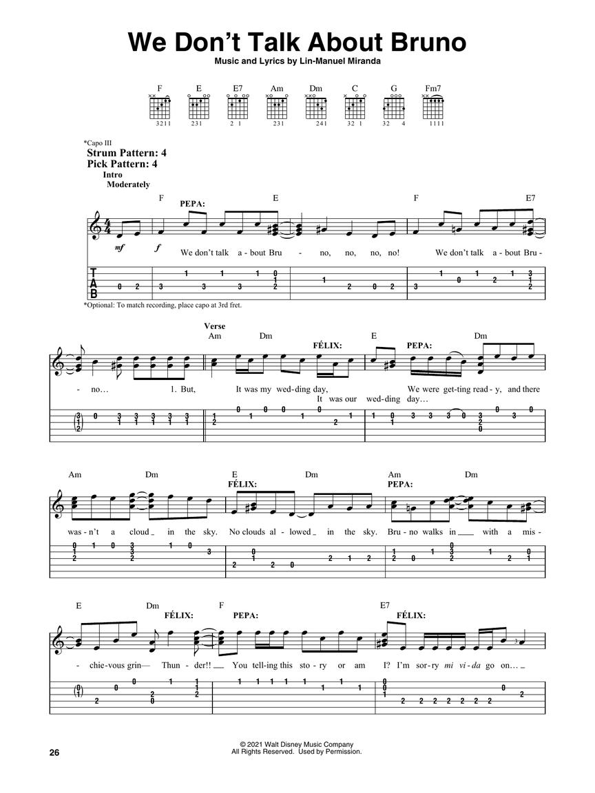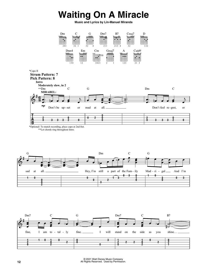 This folio includes nine songs from Disney's latest blockbuster Encanto, featuring an infectious soundtrack by Lin-Manuel Miranda. Songs are arranged for easy guitar with notes and tab along with strum and pick patterns and lyrics.