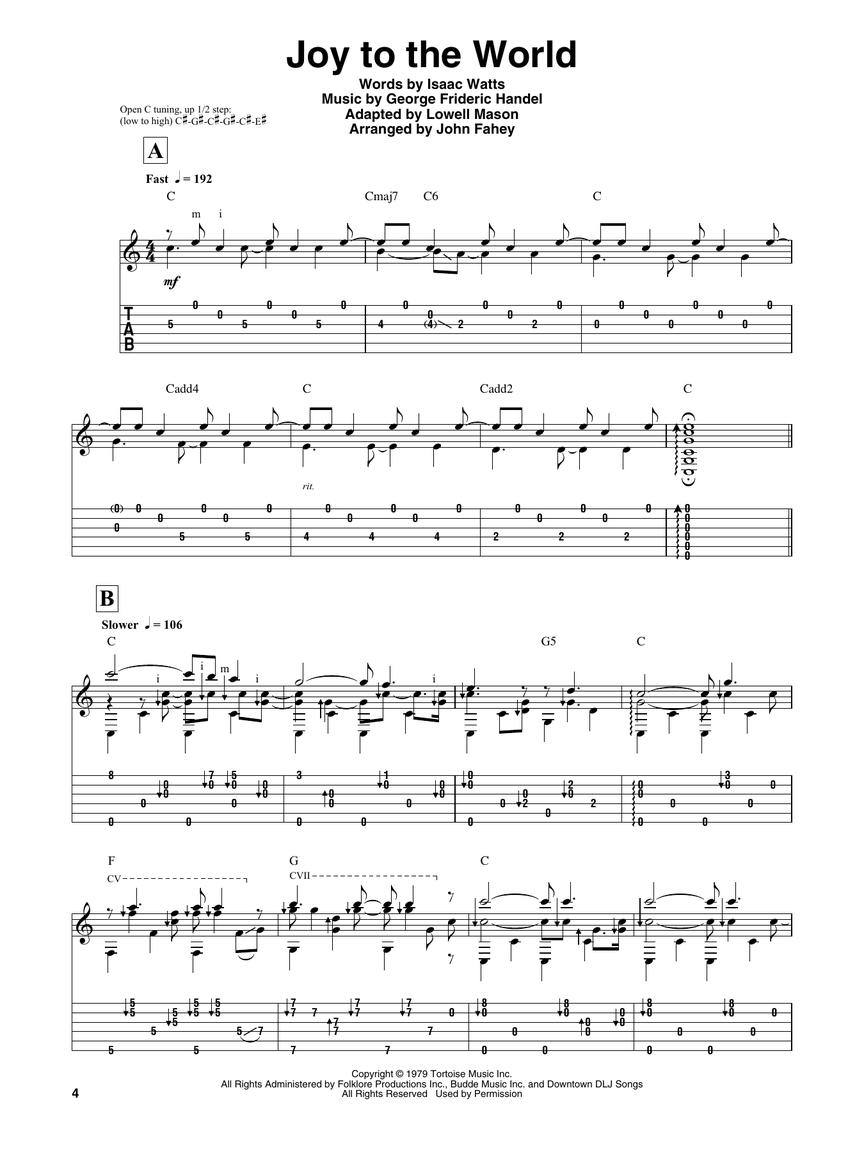 Matching guitar transcriptions to Fahey's iconic 1968 album featuring 14 guitar solo arrangements of Christmas classics: Auld Lang Syne • Bells of St. Mary's • Go I Will Send Thee • God Rest Ye Merry Gentlemen Fantasy • Joy to the World • Lo, How a Rose E're Blooming • Silent Night, Holy Night • and more