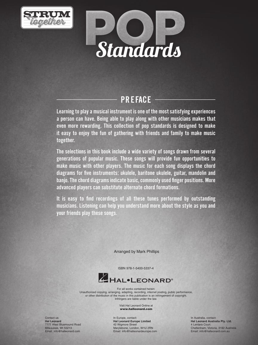 The Strum Together series enables players of five different instruments – or any combination of them – to “strum together” on 70 great songs. This easy-to-use format features melody, lyrics, and chord diagrams for five popular folk instruments: standard ukulele, baritone ukulele, guitar, mandolin, and banjo. This collection includes: All My Loving • The Boys of Summer • Can You Feel the Love Tonight • Don't You (Forget About Me) • Everybody Wants to Rule the World • Free Bird • Hello • I Will Always Love You • My Girl • Open Arms • Sweet Child O' Mine • Unchained Melody • What a Wonderful World • You're the One That I Want • and more.