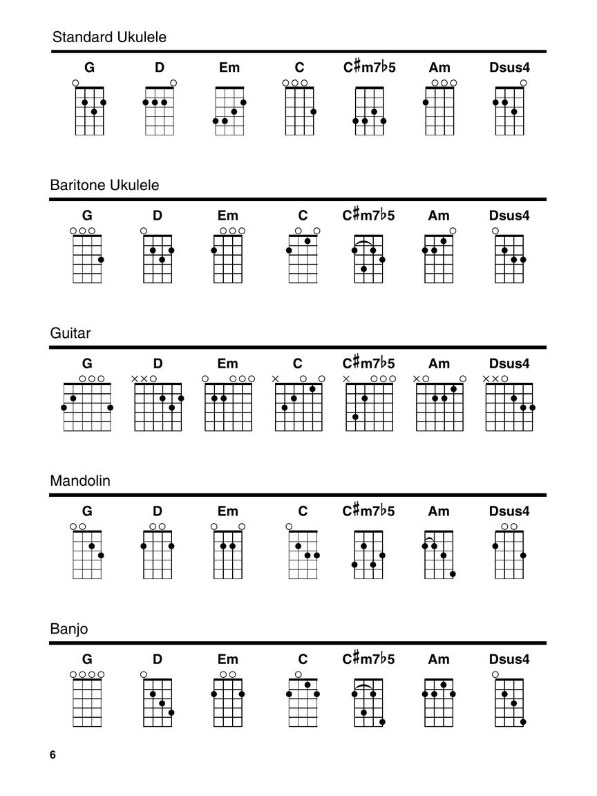 The Strum Together series enables players of five different instruments – or any combination of them – to “strum together” on 70 great songs. This easy-to-use format features melody, lyrics, and chord diagrams for five popular folk instruments: standard ukulele, baritone ukulele, guitar, mandolin, and banjo.