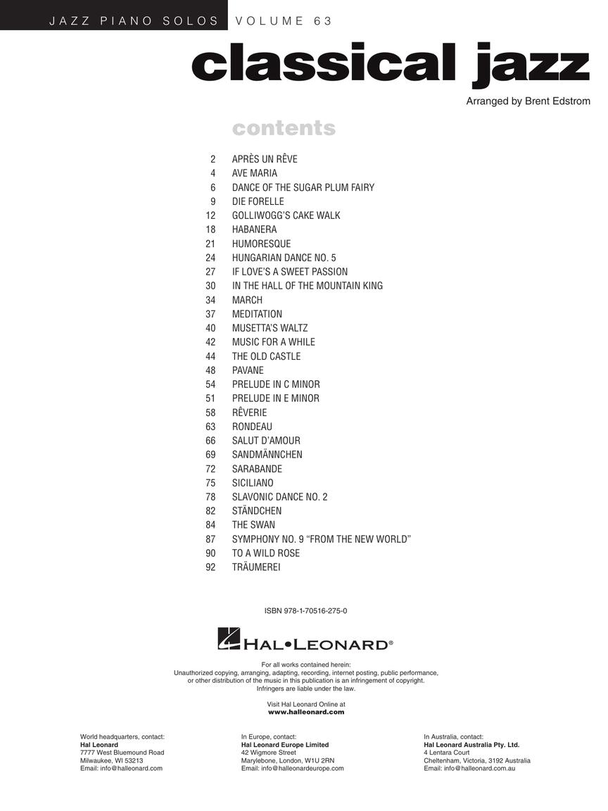 Cada volume da série Hal Leonard Jazz Piano Solos apresenta novos arranjos emocionantes das músicas que ajudaram a definir um estilo. Neste volume único, 30 clássicos favoritos recebem novos e divertidos arranjos jazzísticos; incluindo: Dance of the Sugar Plum Fairy, Op. 71a (Tchaikovsky) • In the Hall of the Mountain King (Grieg) • Meditation (Massenet) • Musetta's Waltz (Quando Men Vo) (Puccini) • Reverie (Debussy) • Salut D'amour (Greeting to Love) (Elgar) • Sandmannchen (The Little Sandman), WoO 31, No. 4 (Brahms) • The Swan (Le Cygne) (Saint-Saëns) • Traumerei (Dreaming), Op. 15, No. 7 (Schumann) • e outras!