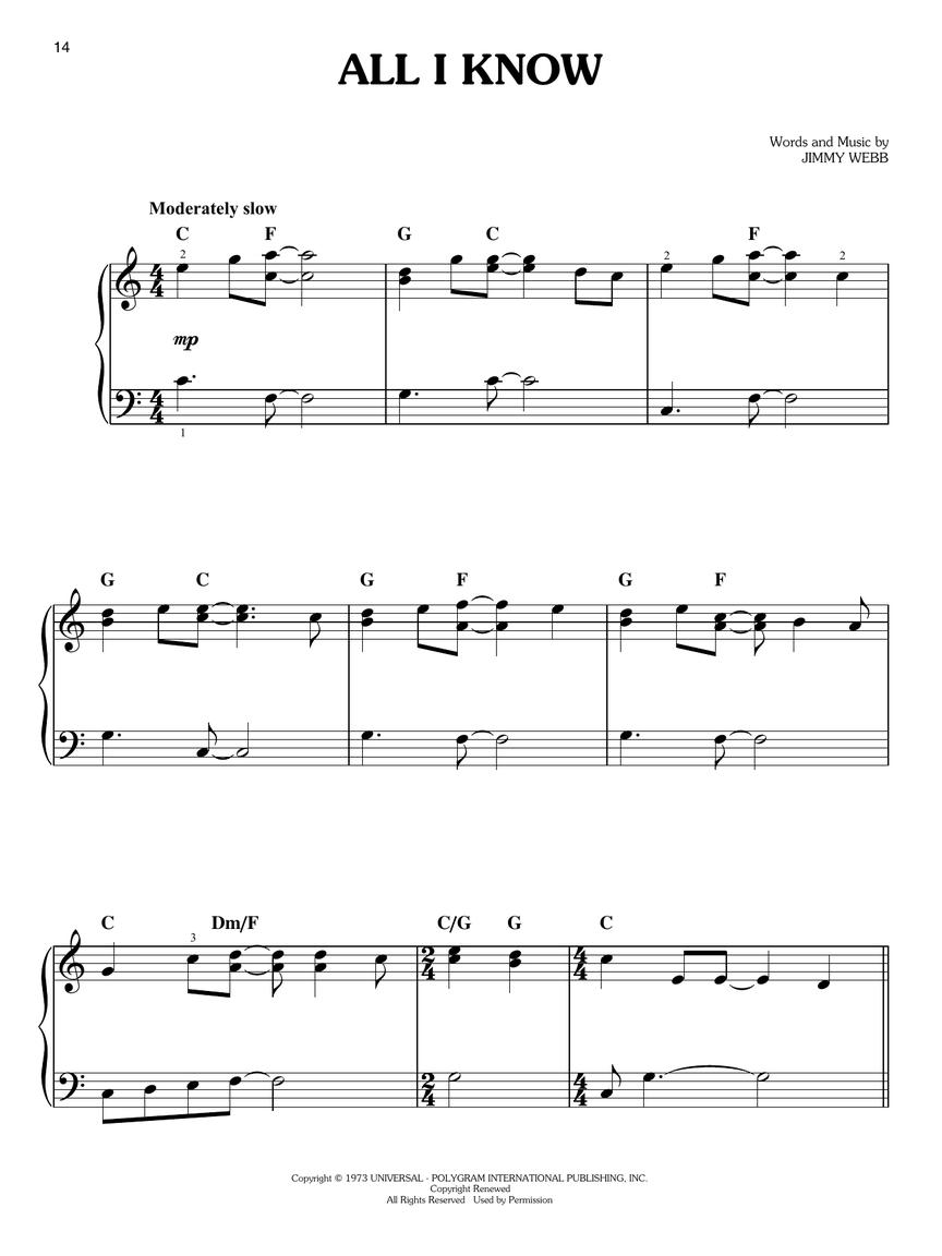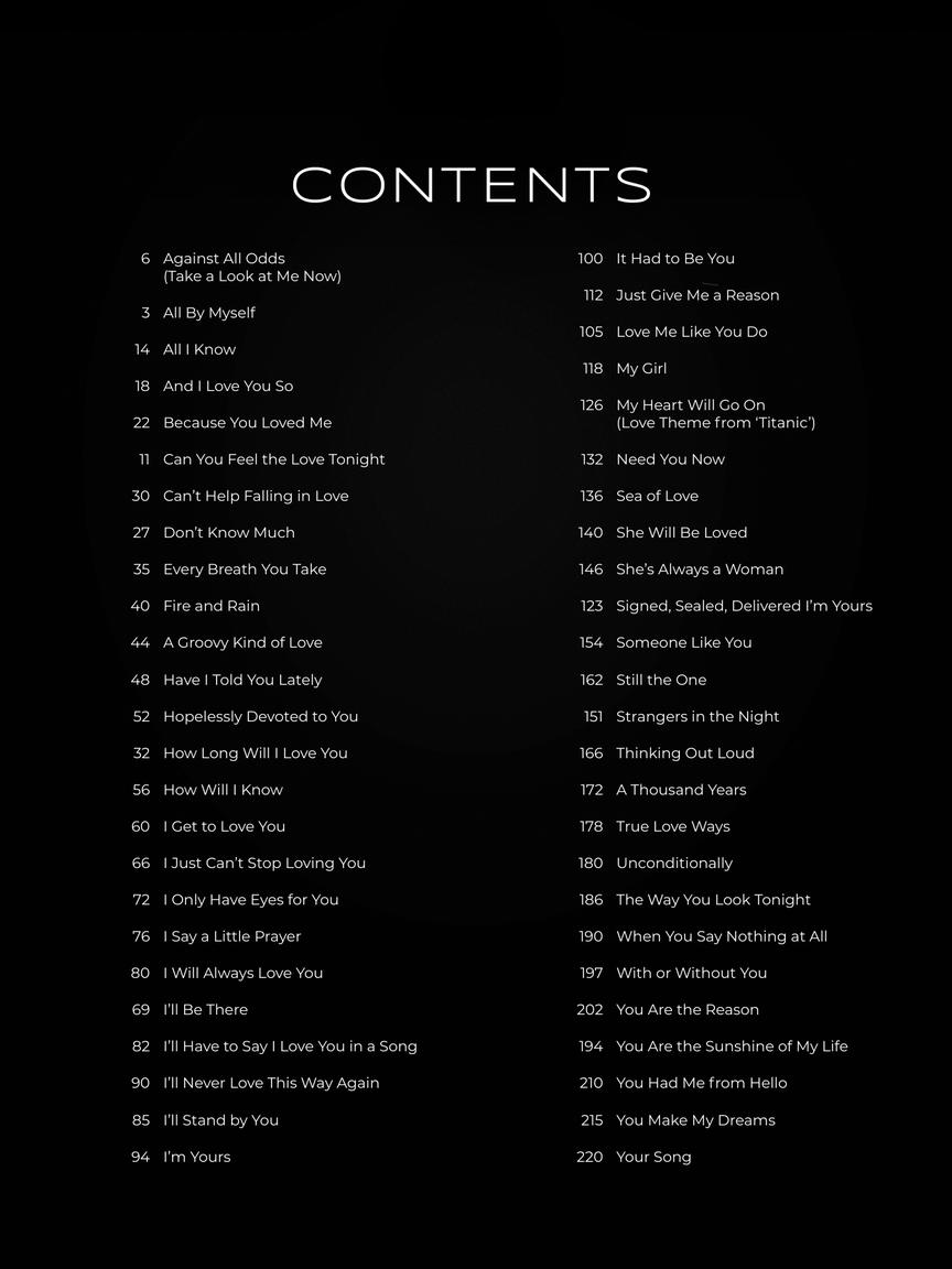 50 great love ballads for beginning pianists to learn, including: Against All Odds (Take a Look at Me Now) • Don't Know Much • I'll Stand by You • Need You Now • Still the One • Unconditionally • The Way You Look Tonight • Your Song • and more.