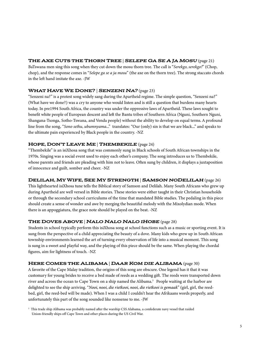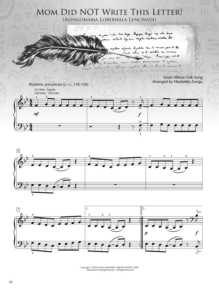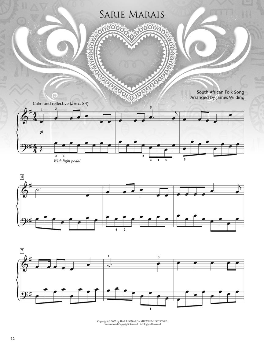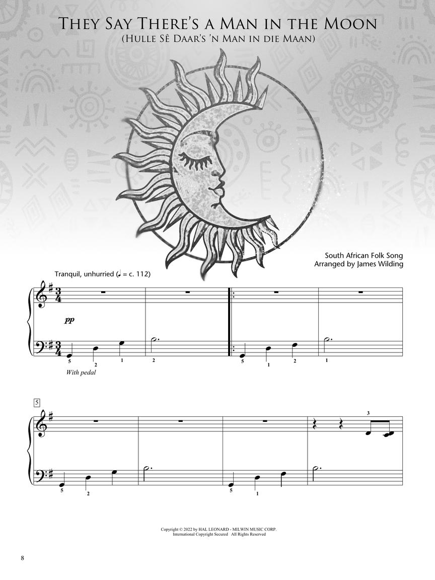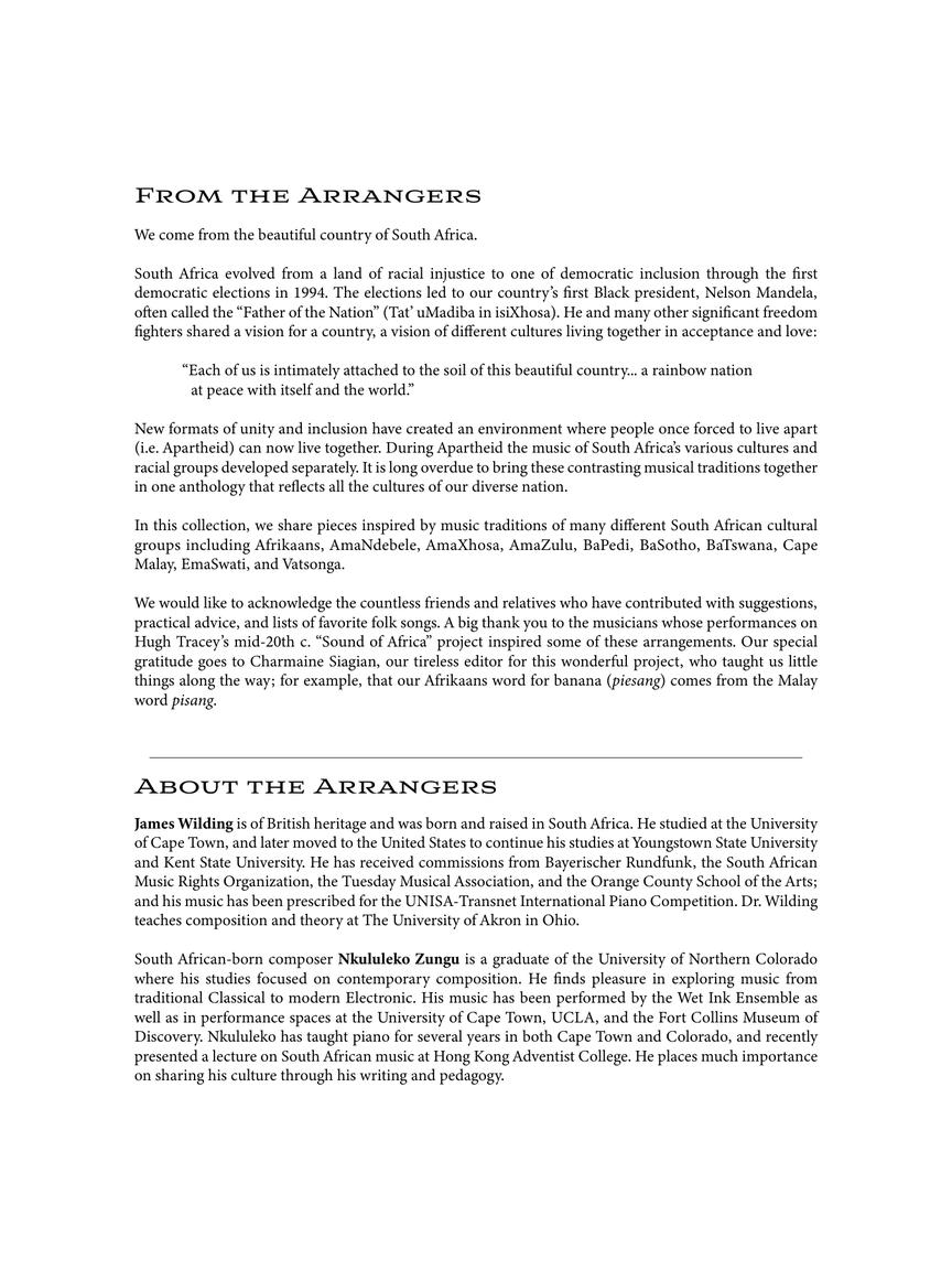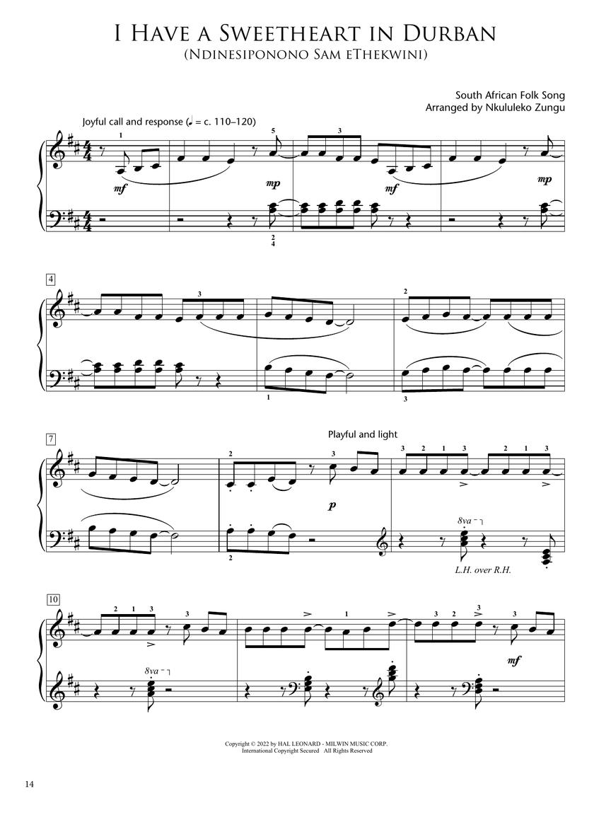 Introduce piano students to the beautiful traditional music of South Africa with these 24 folk songs arranged for piano solo. During apartheid the music of the country's various cultures and groups (Afrikaans, amaNdebele, amaXhosa, amaZulu, Bapedi, Basotho, Batswana, Cape Malay, emaSwati, Vatsonga) developed separately, and the authors felt it long overdue to bring these contrasting musical traditions together. Titles include: The Axe Cuts the Thorn Tree • The Crowing of the Rooster • The Doves Above • God Bless Africa (Nkosi Sikelel' iAfrika) • Here Comes the Alibama • I Have a Sweetheart • Jan Pierewiet • Mama, Who Is This? • Our Dearest Mothers • Sugar Bush • They Say There's a Man in the Moon, and more!