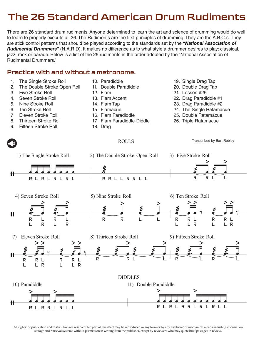 This handy 4-page chart presents all 26 rudiments written out and also recorded so players can hear a demonstration of each. In addition, there's a bonus song by the editor that is comprised of six of the 26 rudiments for students to play.