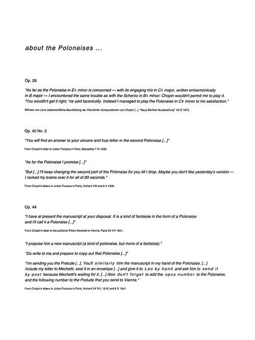 The Performance Commentary appended to each volume includes: the realization of ornaments, comments on pedal markings (the original markings sometimes are inadequate, due to the difference in sound between pianos used in Chopin`s times and modern pianos), suggestions as to the “harmonic legato” (a performance technique often used by Chopin and now forgotten).