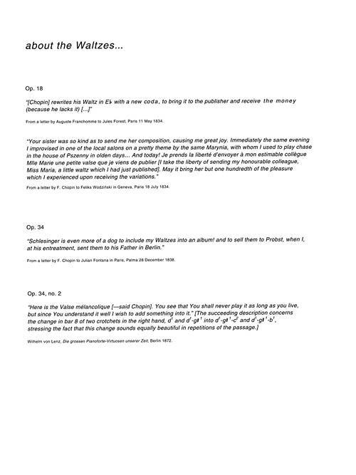 Includes 11 Waltzes published posthumously: A minor, 3 Waltzes in A-flat Major, D-flat Major, E minor, 2 Waltzes in F minor, G-flat Major, and 2 Waltzes in B minor. See 00132358 for the Waltzes published during the composer's lifetime.
