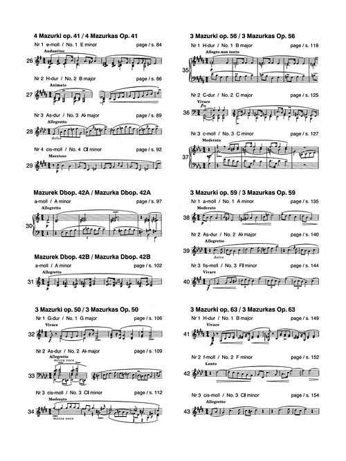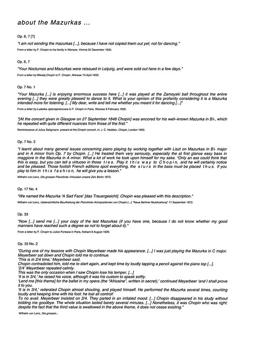 Chopin composed his “Mazurkas” continuously from 1825 to 1849. Inspired by Polish folk dance, Chopin's mazurkas gradually became compositions of meditative lyricism, and the most personal statement of expression. Of the variants in musical notation, those designated ossia were marked in this way by Chopin himself or inscribed in his hand in pupils' copies. See also 00132282 for the Mazurkas published posthumously.arked in this way by Chopin himself or inscribed in his hand in pupils' copies, while those without this indication result from textual divergences in authentic copies or from difficulties in reading the text in an unambiguous way.