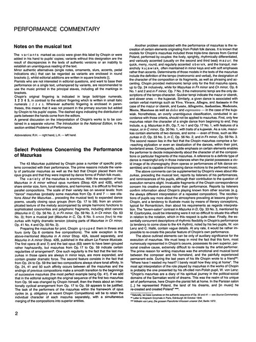 The Performance Commentary appended to each volume includes: the realization of ornaments, comments on pedal markings (the original markings sometimes are inadequate, due to the difference in sound between pianos used in Chopin`s times and modern pianos), suggestions as to the “harmonic legato” (a performance technique often used by Chopin and now forgotten).