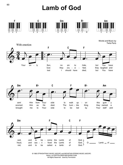 60 super easy arrangements for piano with simple right-hand melodies, letter names inside each note, basic left-hand chord diagrams, and lyrics! Songs include: Blessed Be Your Name · Cornerstone · How Great Is Our God · I Could Sing of Your Love Forever · In Christ Alone · The Lion and the Lamb · Mighty to Save · Reckless Love · 10,000 Reasons (Bless the Lord) · What a Beautiful Name · Your Grace Is Enough · and more.