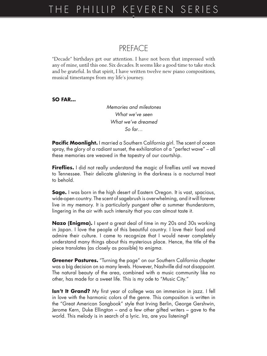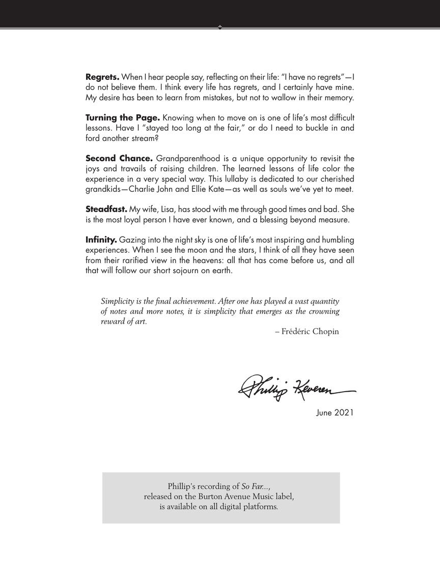 A deeply personal collection of original piano solos from Phillip Keveren commemorating his six decades on the planet. The 12 beautifully written pieces range from intimate reflections to advanced showpieces and represent the important events and loves in his life. A recording is also available via Burton Avenue Music.
