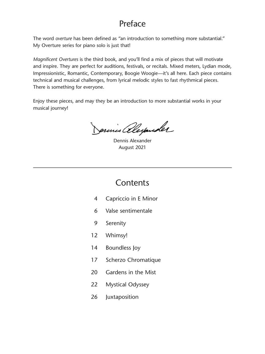 “Overture” has been defined as an introduction to something more substantial. Dennis Alexander's Overture series is just that! Magnificent Overtures is the final volume and features repertoire perfect for auditions, festivals, and recitals. Featuring everything from mixed meters to a romantic waltz to impressionism, it's all here! Titles: Boundless Joy • Capriccio in E Minor • Gardens in the Mist • Juxtaposition • Mystical Odyssey • Scherzo Chromatique • Serenity • • Whimsy! • Valse Sentimentale.