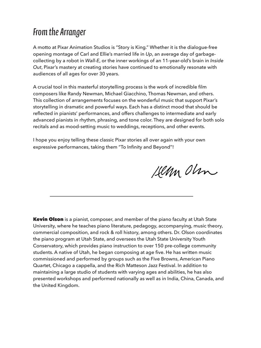 15 beloved songs from the Pixar movies arranged especially for piano solo. The accessible arrangements are for intermediate to early advanced level pianists and are designed for solo recitals as well as mood-setting music to special occasions! Includes: Bundle of Joy (Inside Out) • If I Didn't Have You (Monsters Inc.) • The Incredits (The Incredible) • Lava • Married Life (Up) • Ratatouille Main Theme • Remember Me (Coco) • The Time of Your Life (A Bug's Life) • Touch the Sky (Brave) • When She Loved Me (Toy Story 2) • and more!